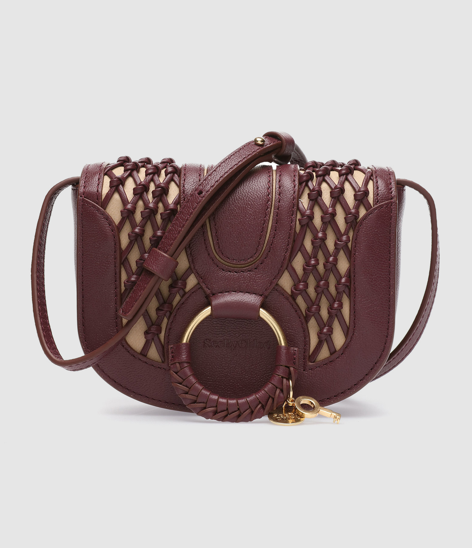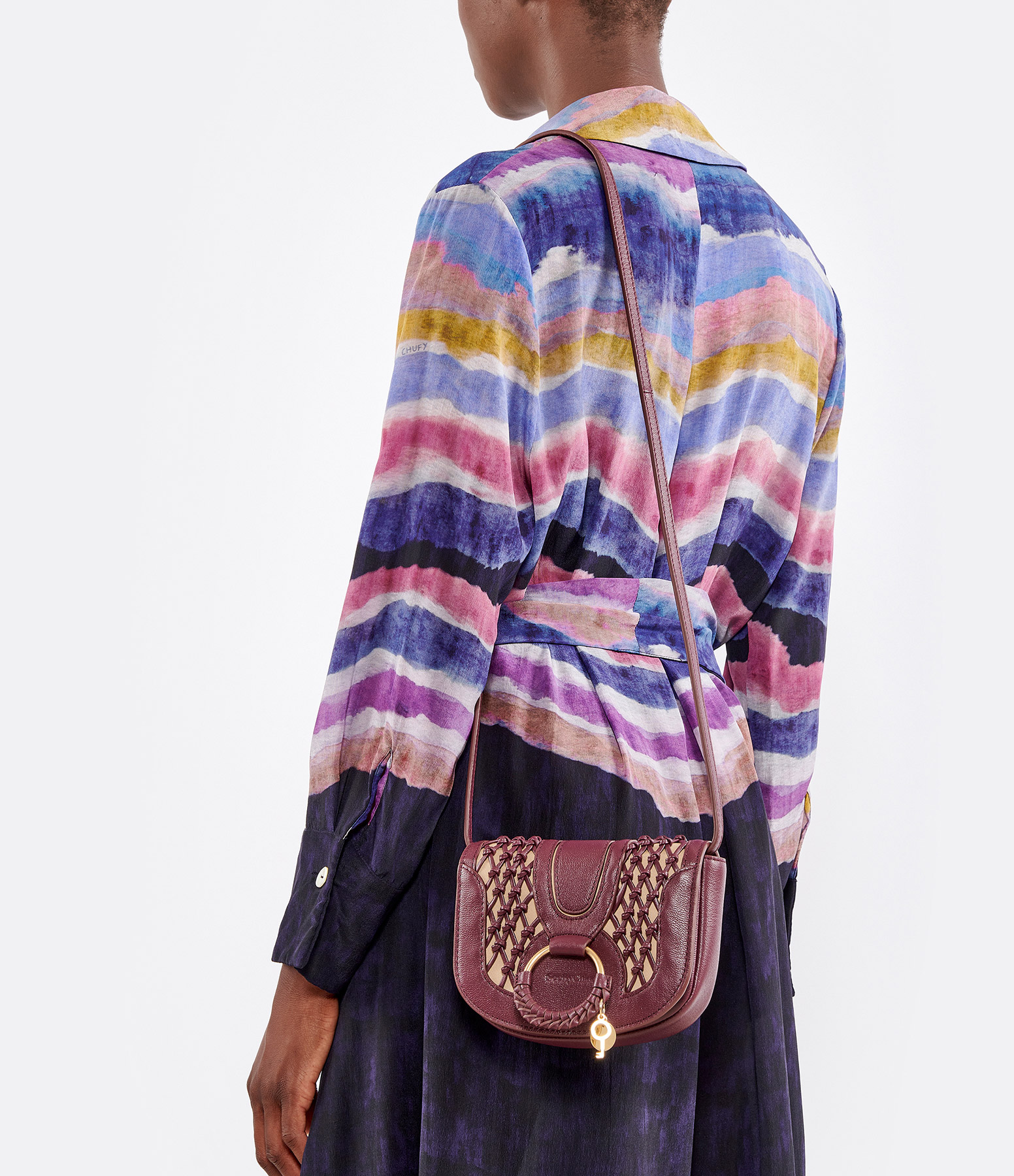 Sac en cuir grainé violet. Effet résille laissant apparaitre une doublure en toile de coton beige. Fermeture par rabat aimanté avec anneau décoratif. Bandoulière réglable. Intérieur doublé en toile de coton composé d'un grand compartiment et d'une poche plaquée.