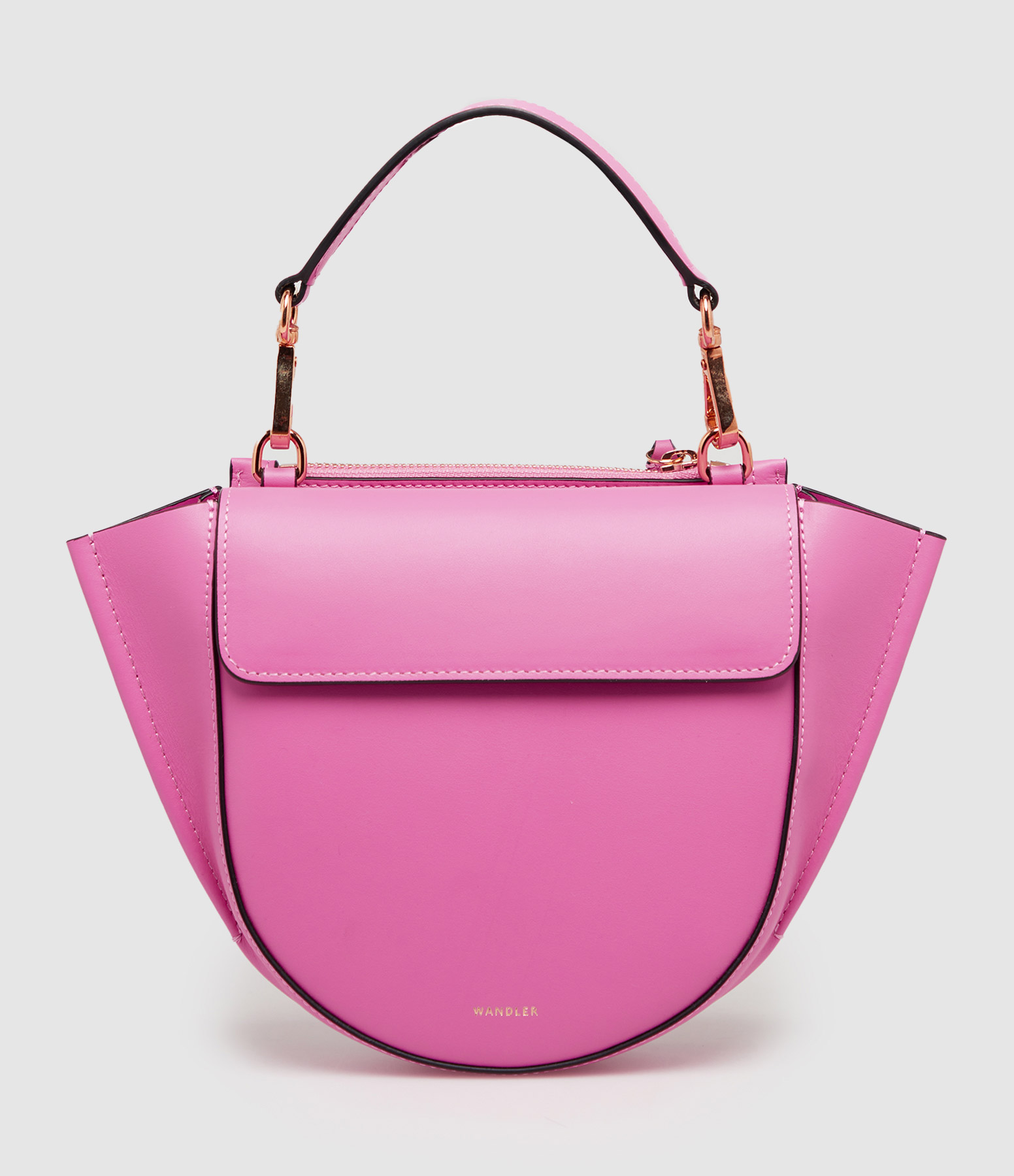 Petit sac rond en cuir lisse rose. Composé d'un grand compartiment avec poche plaquée fermée par un rabat aimanté et d'une poche zippée et plaquée au dos. Anse amovible pour un porté main ou épaule et bandoulière amovible et ajustable pour un porté en cross body.