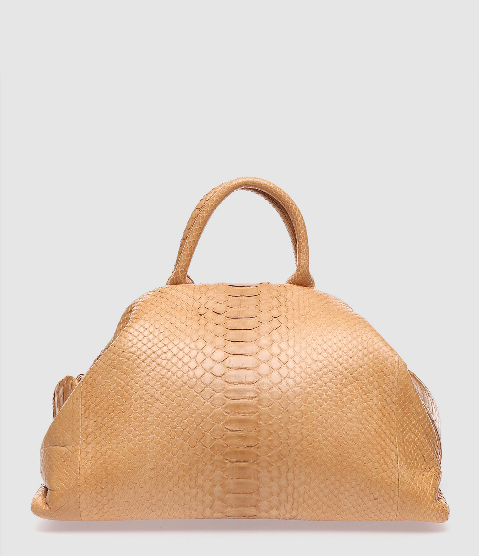 Sac à main en cuir de python marron. Deux anses pour un porté main et une bandoulière. Fermeture par rabat aimanté. Une poche plaquée à l'intérieur.