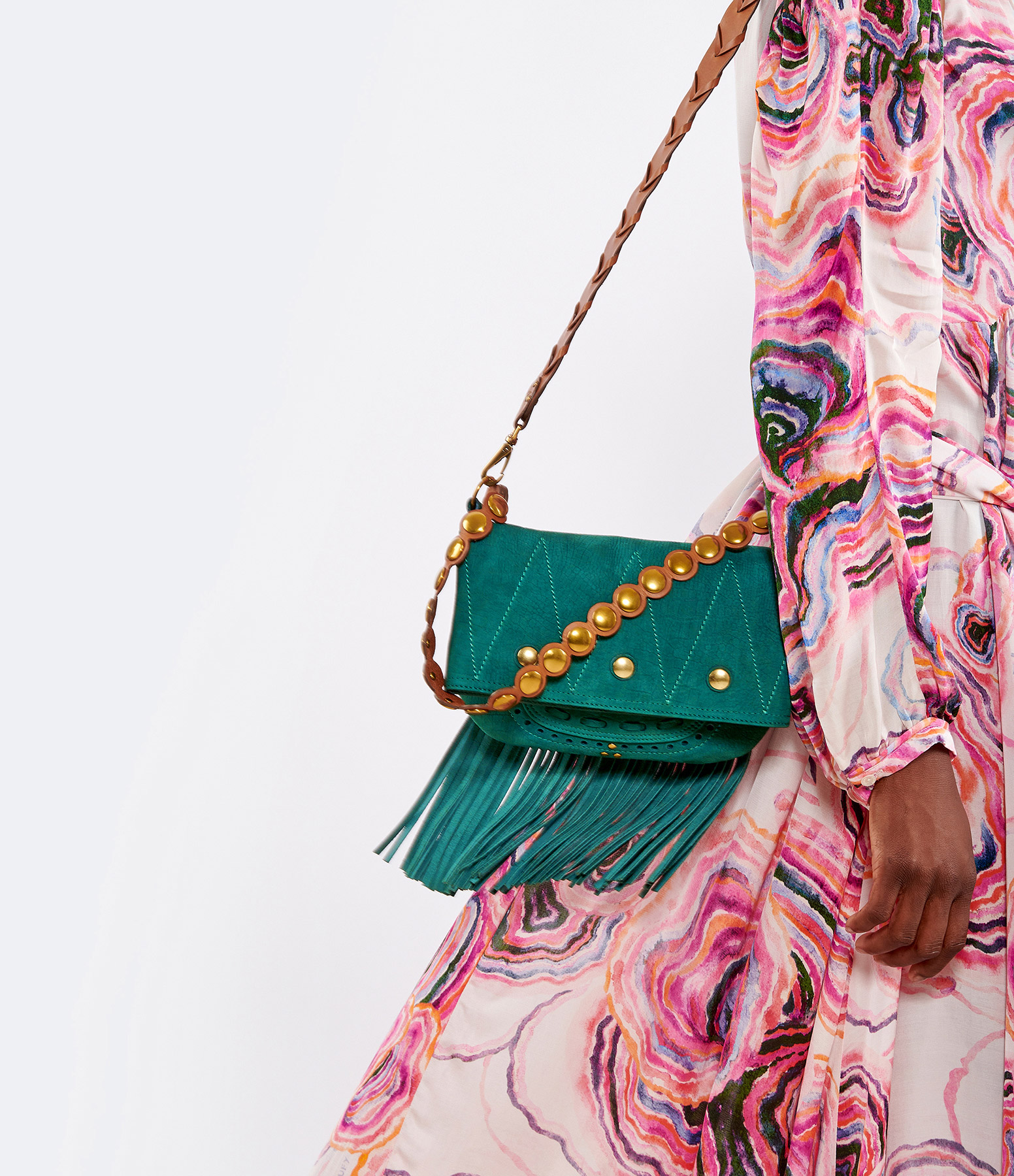 Sac à main en cuir croco émeraude, avec franges amovibles par pressions sous le sac. Une anse et une bandoulière tressée amovible. Intérieur doublé en coton avec un compartiment dans le rabat, un sous le rabat, et une petite poche plaquée.