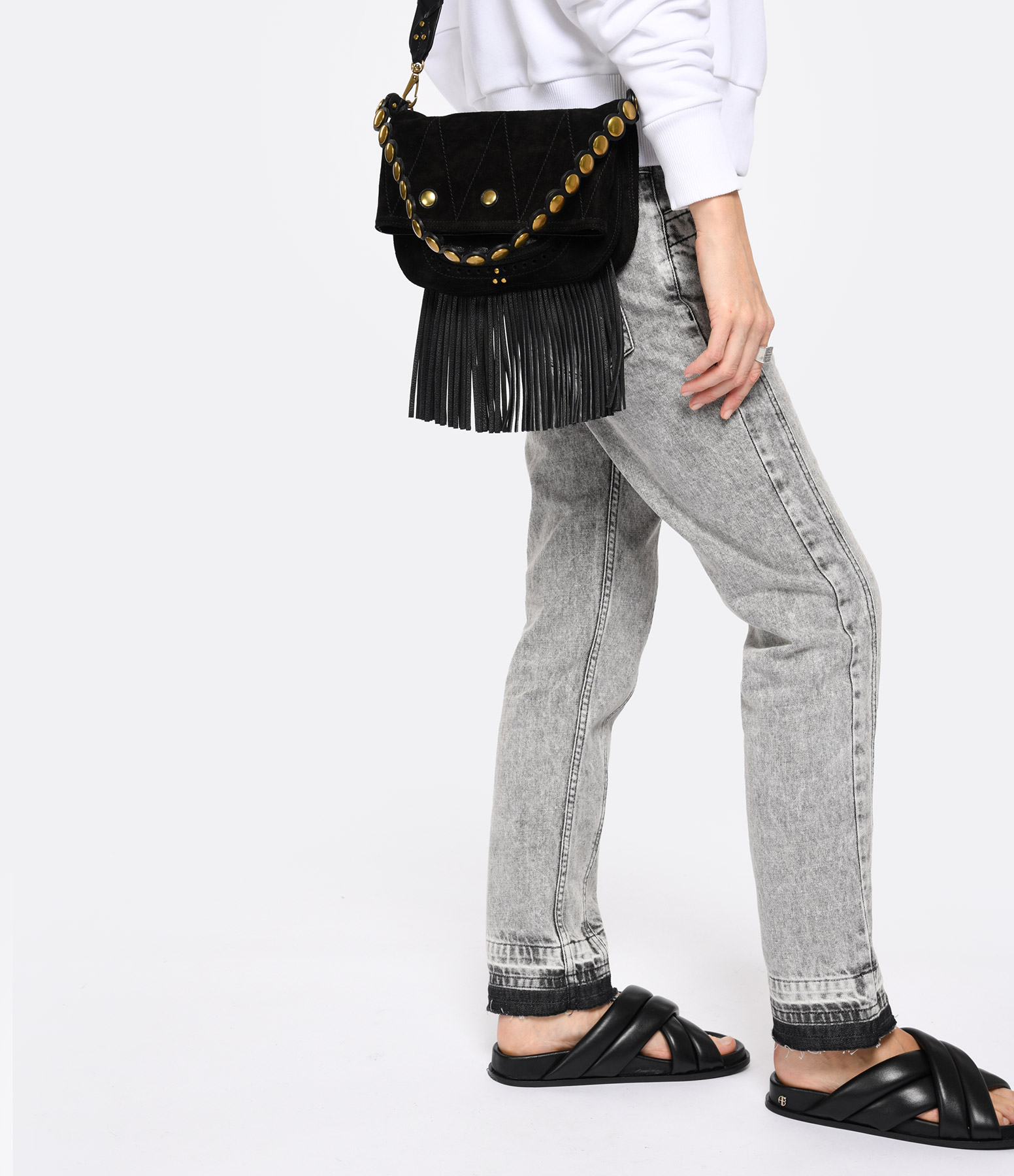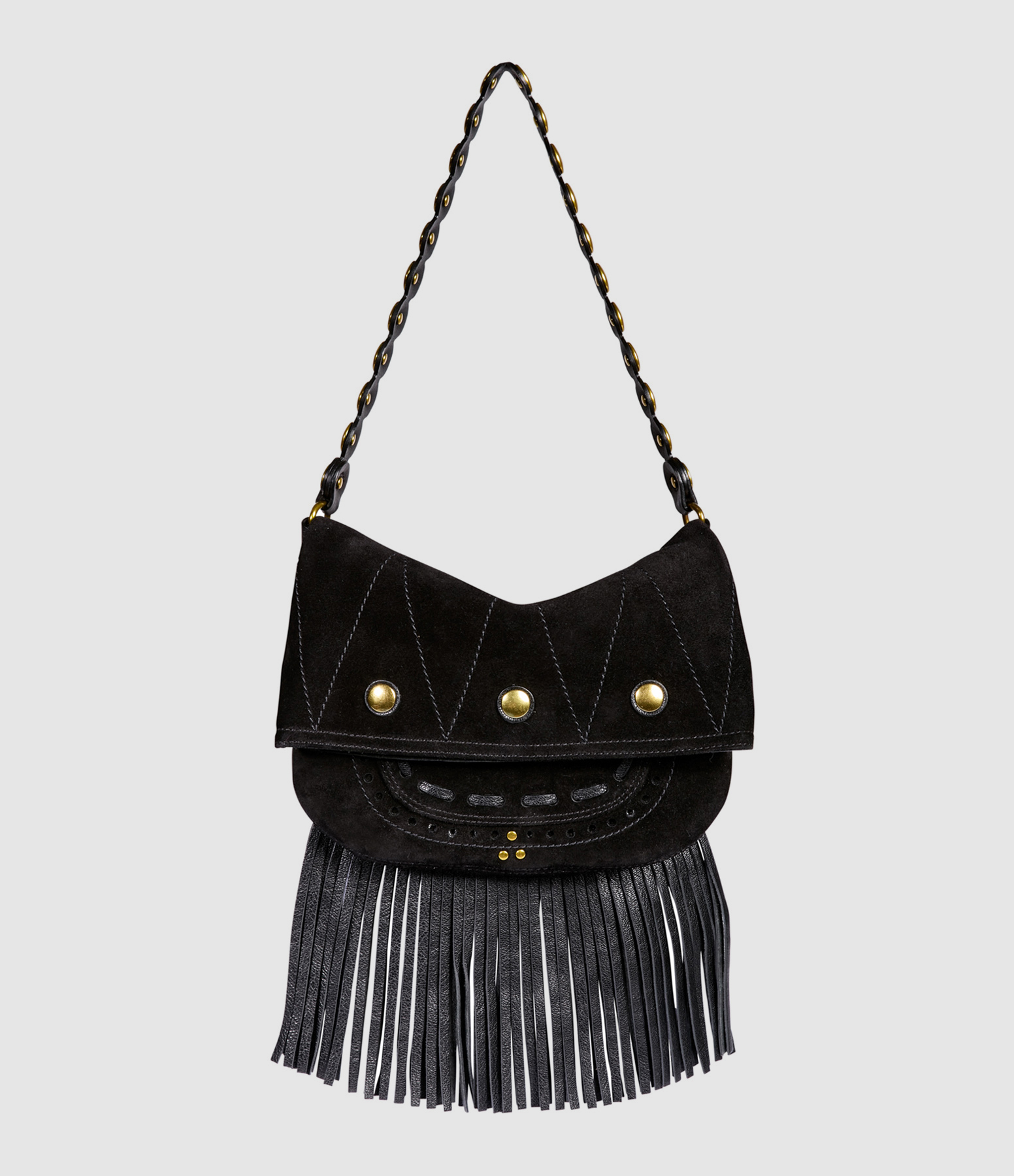 Sac à main en cuir suédé noir, avec franges amovibles par pressions sous le sac. Une anse et une bandoulière tressée amovible. Intérieur doublé en coton avec un compartiment dans le rabat, un sous le rabat, et une petite poche plaquée.