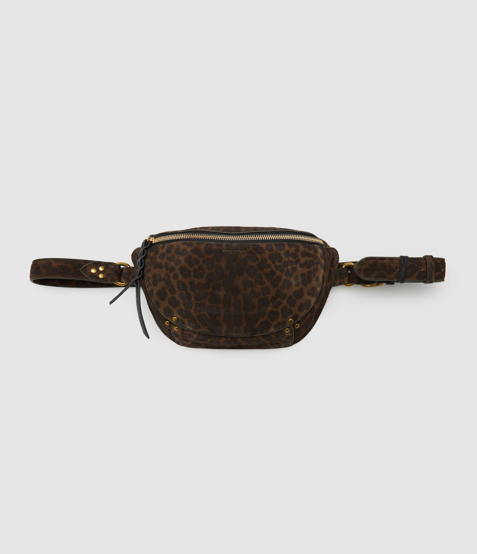 Sac banane en cuir suédé imprimé léopard kaki, avec poche zippée au dos. Ceinture réglable. Fermeture zippée. Intérieur doublé en coton avec une petite poche plaquée.