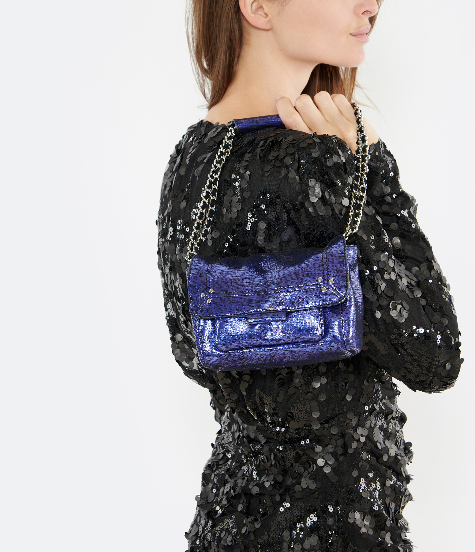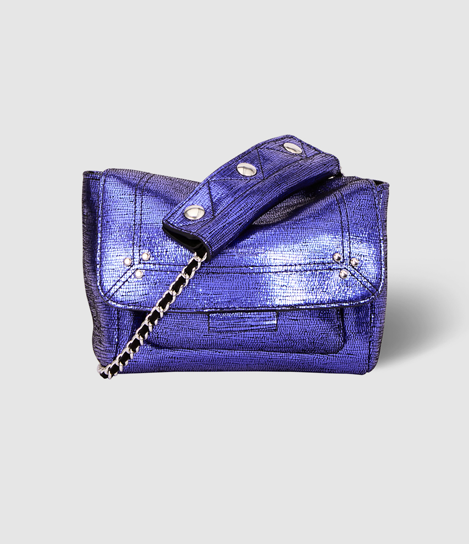 Sac en cuir lamé bleu avec poche zippée au dos. Bandoulière tressée en cuir et chaîne, amovible par mousquetons, et réglable en deux longueurs. Fermeture par rabat aimanté avec poche plaquée sous le rabat. Intérieur doublé en coton avec une poche zippée.