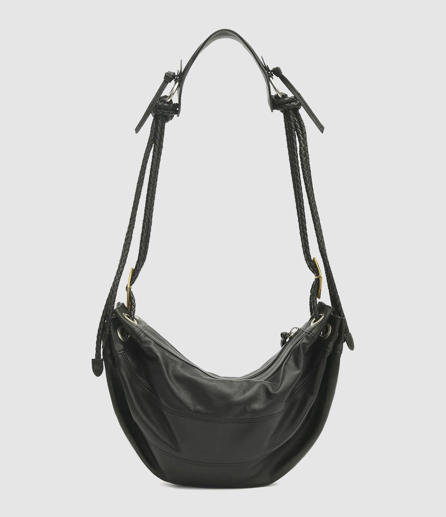 Sac en cuir d’agneau noir au design plissé, à porter à l’épaule. Il est doté d’une anse ajustable en cuir lisse surpiqué et de doubles cordons en cuir tressé, agrémentés de finitions métalliques gravées « Isabel Marant ». Fermeture zippée en métal, logo embossé à l’avant et ses détails de lanières en cuir. L’intérieur, doublé en textile, comprend une poche porte-carte en cuir lisse.