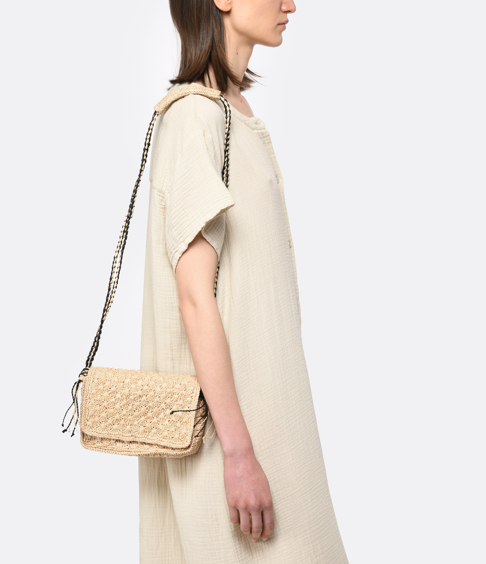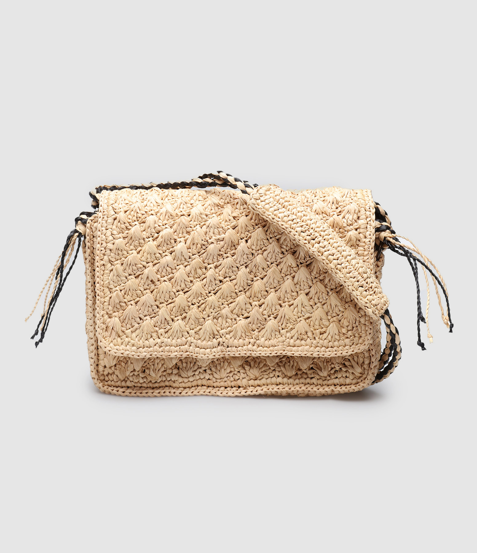 Sac en paille à rabat beige et détails noirs. Deux bandoulières. Une poche plaquée à l'intérieur. Fermeture aimantée.