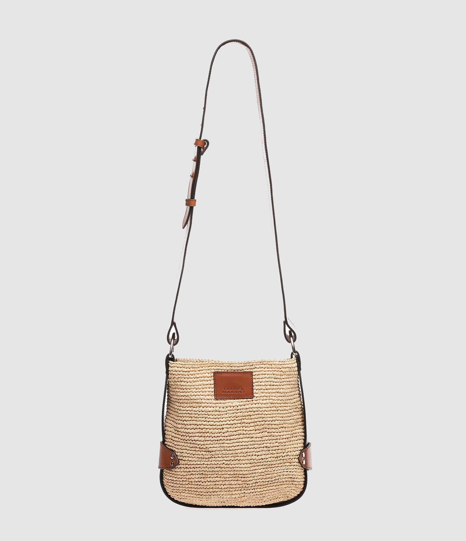 Sac seau en raphia beige. Bandoulière ajustable en cuir cognac. Fermeture par cordons en cuir noir. Jacron en cuir cognac avec inscription "ISABEL MARANT" gravée.