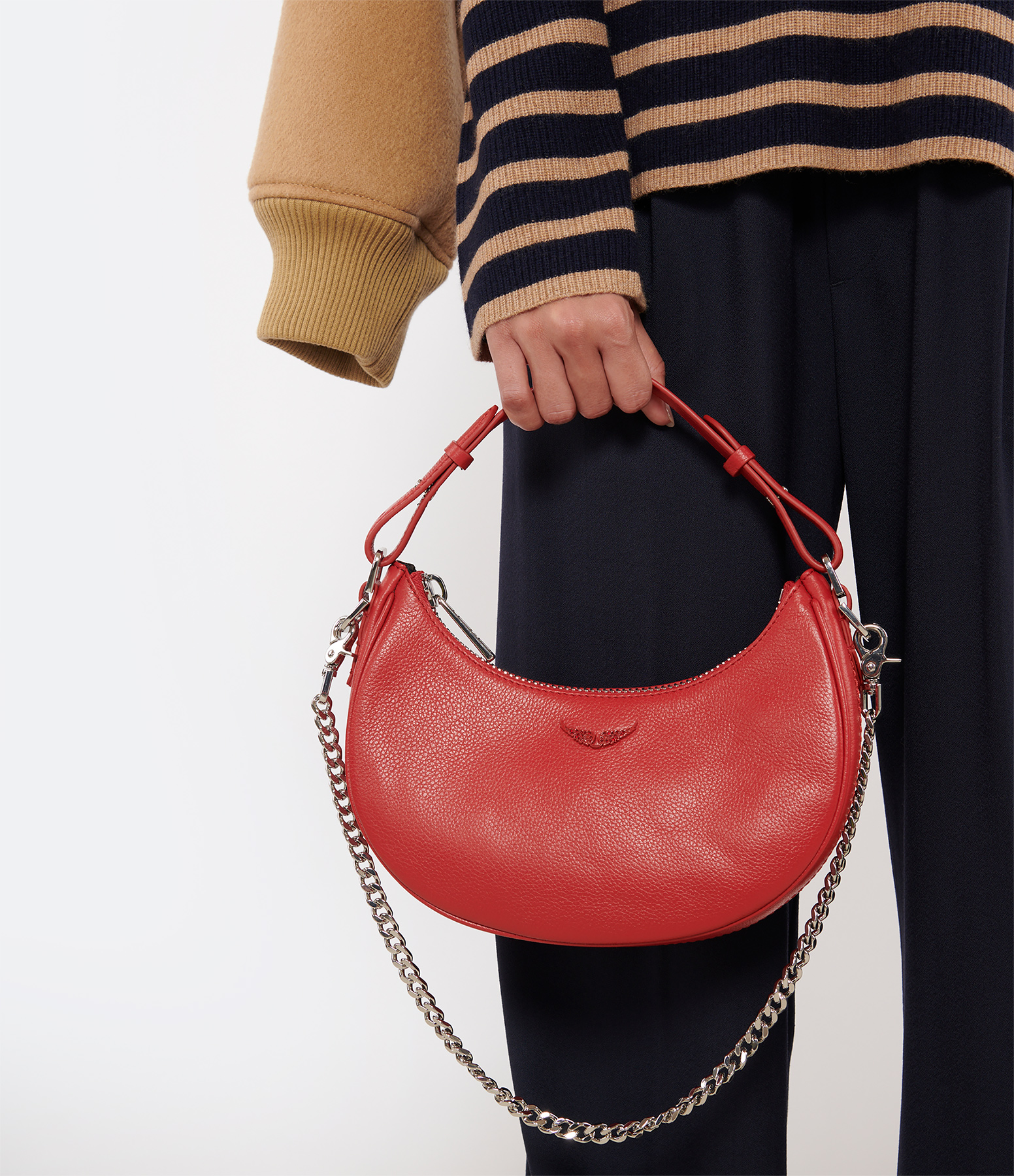 Sac en cuir grainé rouge en forme de demi-lune. Anse en cuir réglable pour un porté main et bandoulière en nylon amovible et réglable pour un porté épaule ou cross body. Chaine décorative argentée. Fermeture par zip argenté. Ailes emblématiques de la marque strassées à l'avant. Un grand compartiment doublé en tissu noir avec une poche plaquée en cuir rouge.
