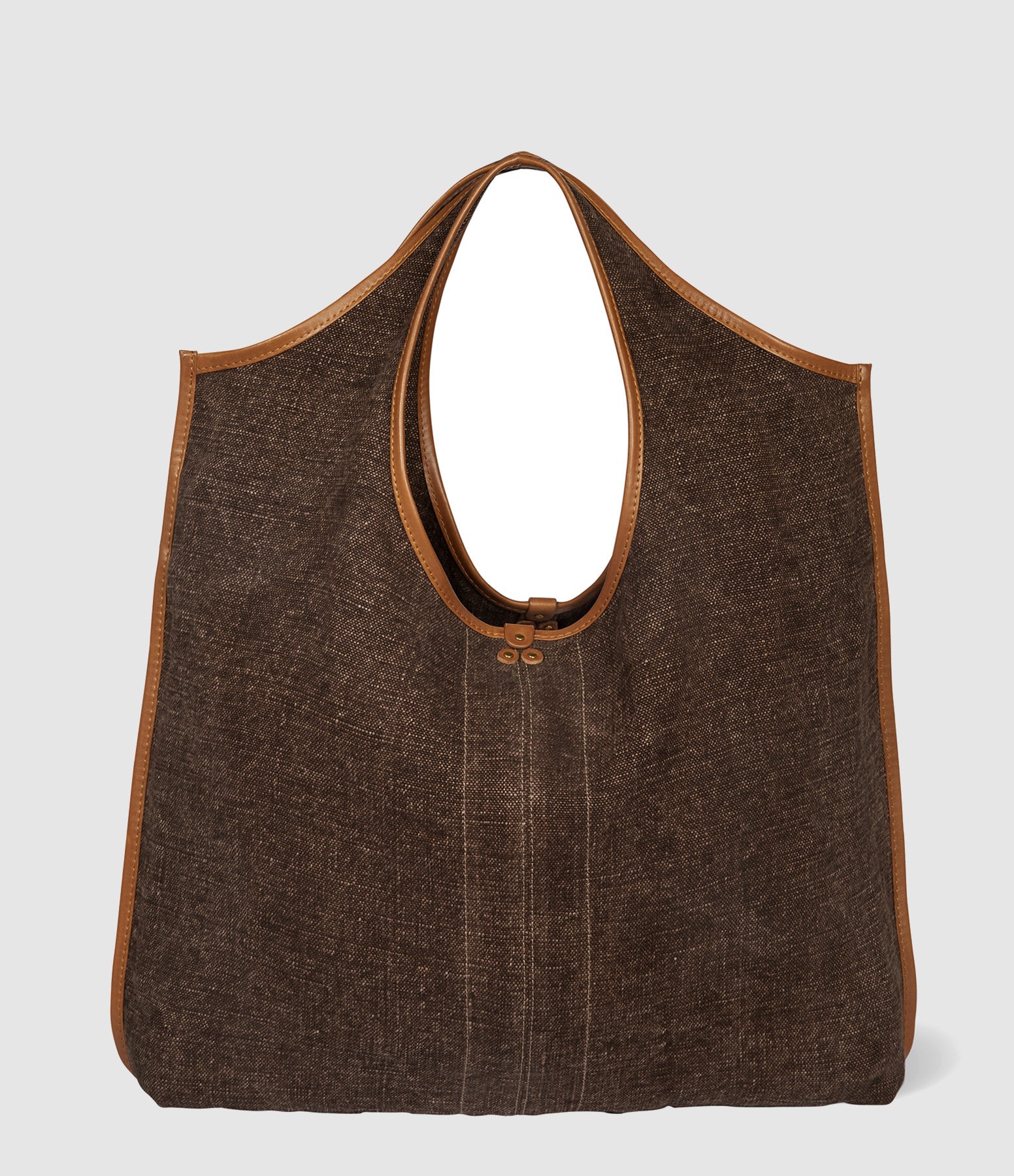 Tote bag souple effet lin, rehaussé de détails en cuir marron. Ses anses rondes permettent un porté confortable à l’épaule.