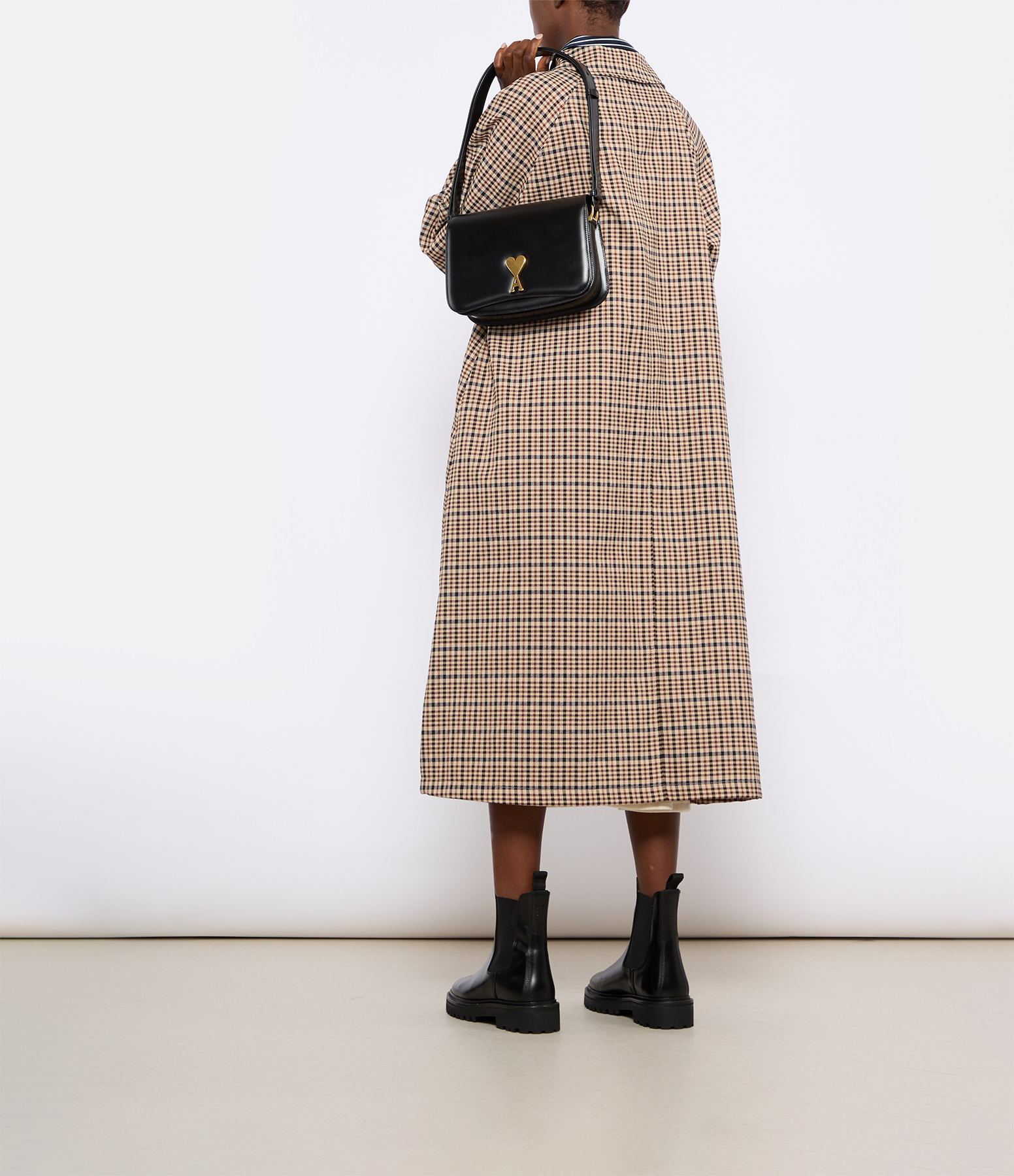 Sac bandoulière en cuir lisse noir. Organisé dans un grand compartiment avec une poche plaquée à l'intérieur et deux poches plaquées latérales. Fermeture par rabat aimanté. Logo Ami de cœur doré aimanté à l'avant. Bandoulière réglable pour un porté cross body ou porté épaule.