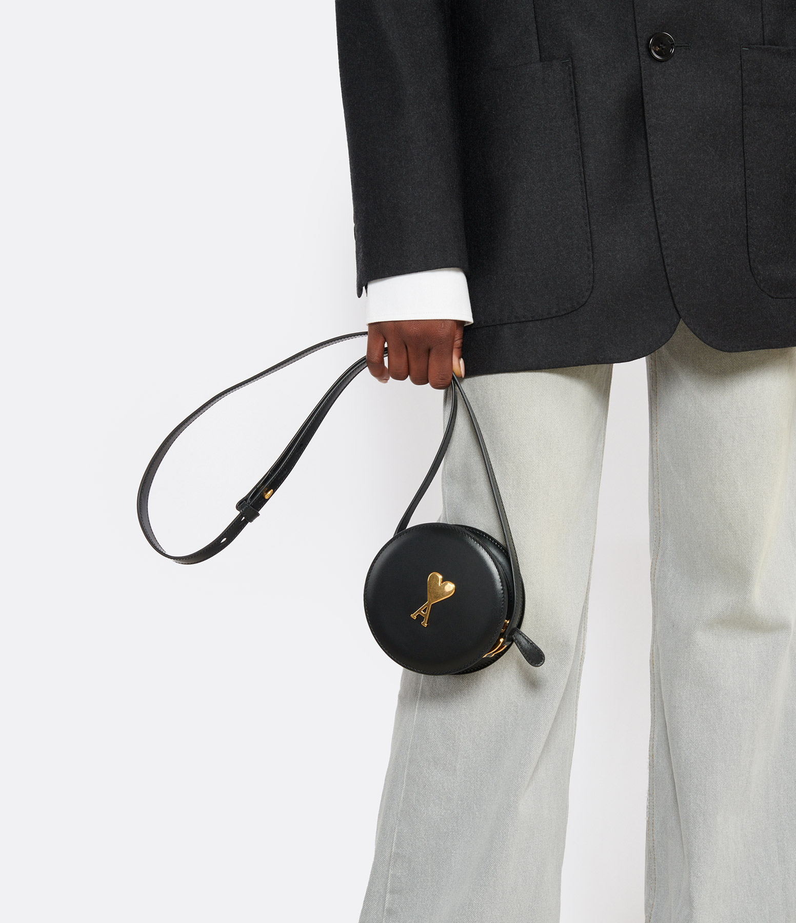 Sac rond en cuir lisse noir. Rivet Ami de Cœur. Un compartiment central zippé. Bandoulière en cuir ajustable.