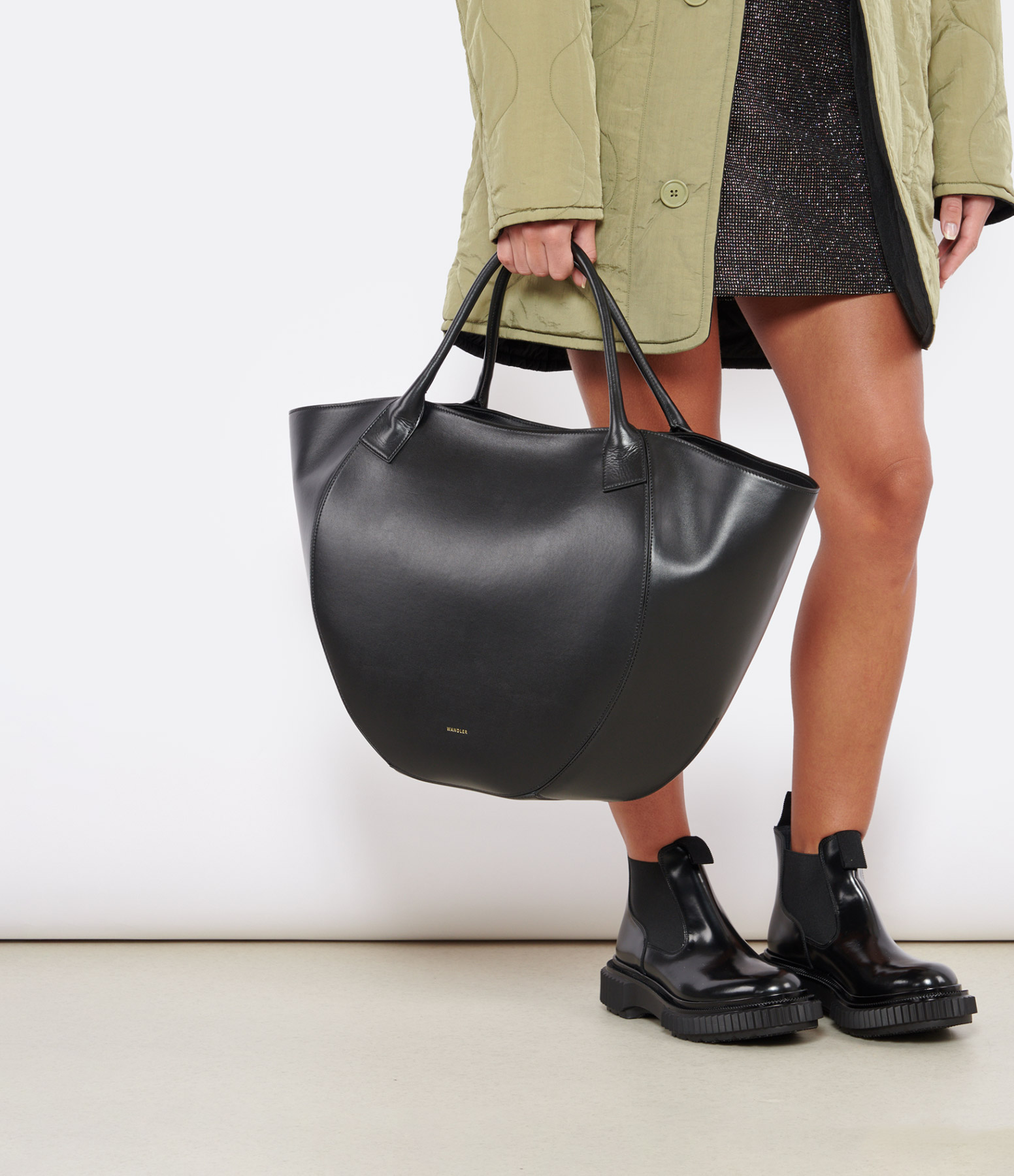 Sac à main en cuir lisse noir. Fermeture zippée. Un compartiment principal. Une poche intérieure. Une poche arrière zippée. Bandoulière amovible.