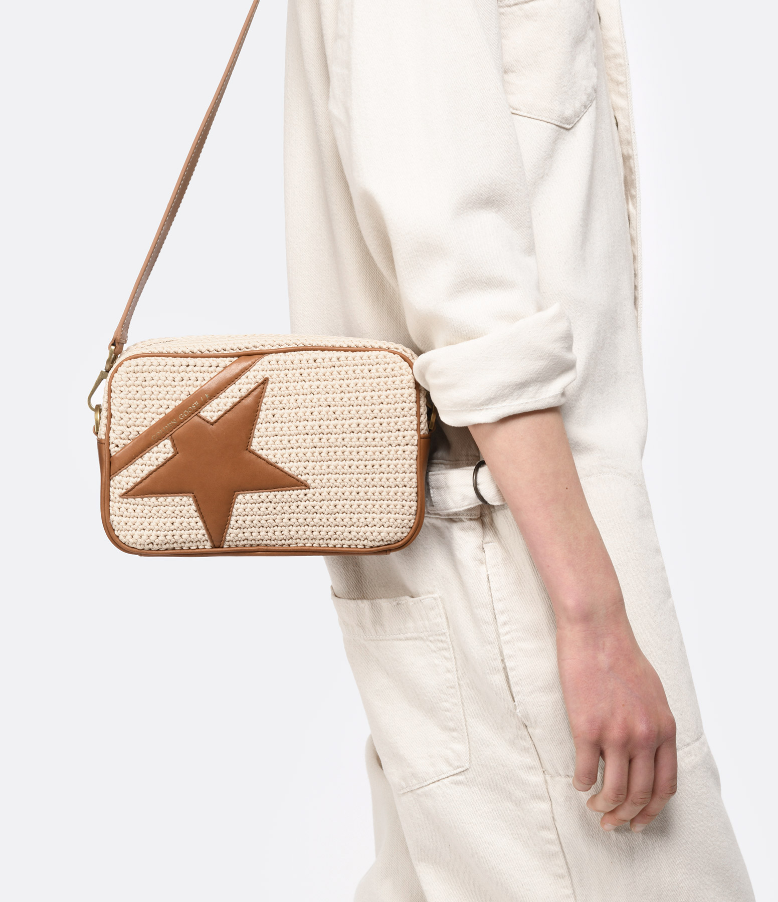 Sac de forme "camera bag" en crochet beige avec un empiècement du logo étoile en cuir lisse marron sur le devant. Une poche plaquée à l'avant. Bandoulière en cuir lisse marron amovible par mousquetons et réglable sur six longueurs. Fermeture zippée. Intérieur doublé en tissu avec une poche plaquée.
