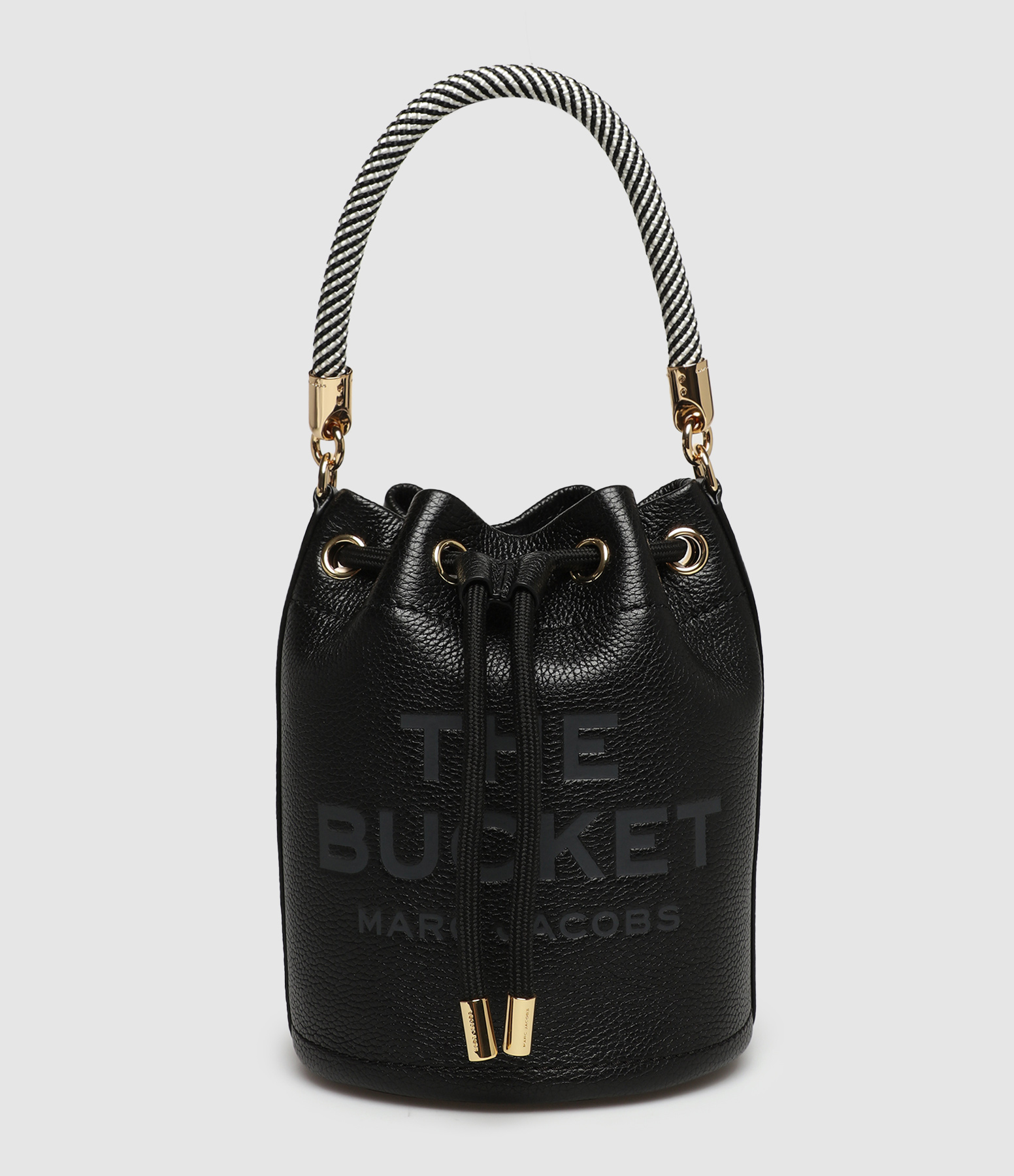 Sac seau en cuir grainé noir. Inscription "THE BUCKET MARC JACOBS" ton sur ton. Une petite anse en corde noire et blanche et un grande ans en cuir noir. Rivets métalliques dorés sur le haut. Doublure en coton.