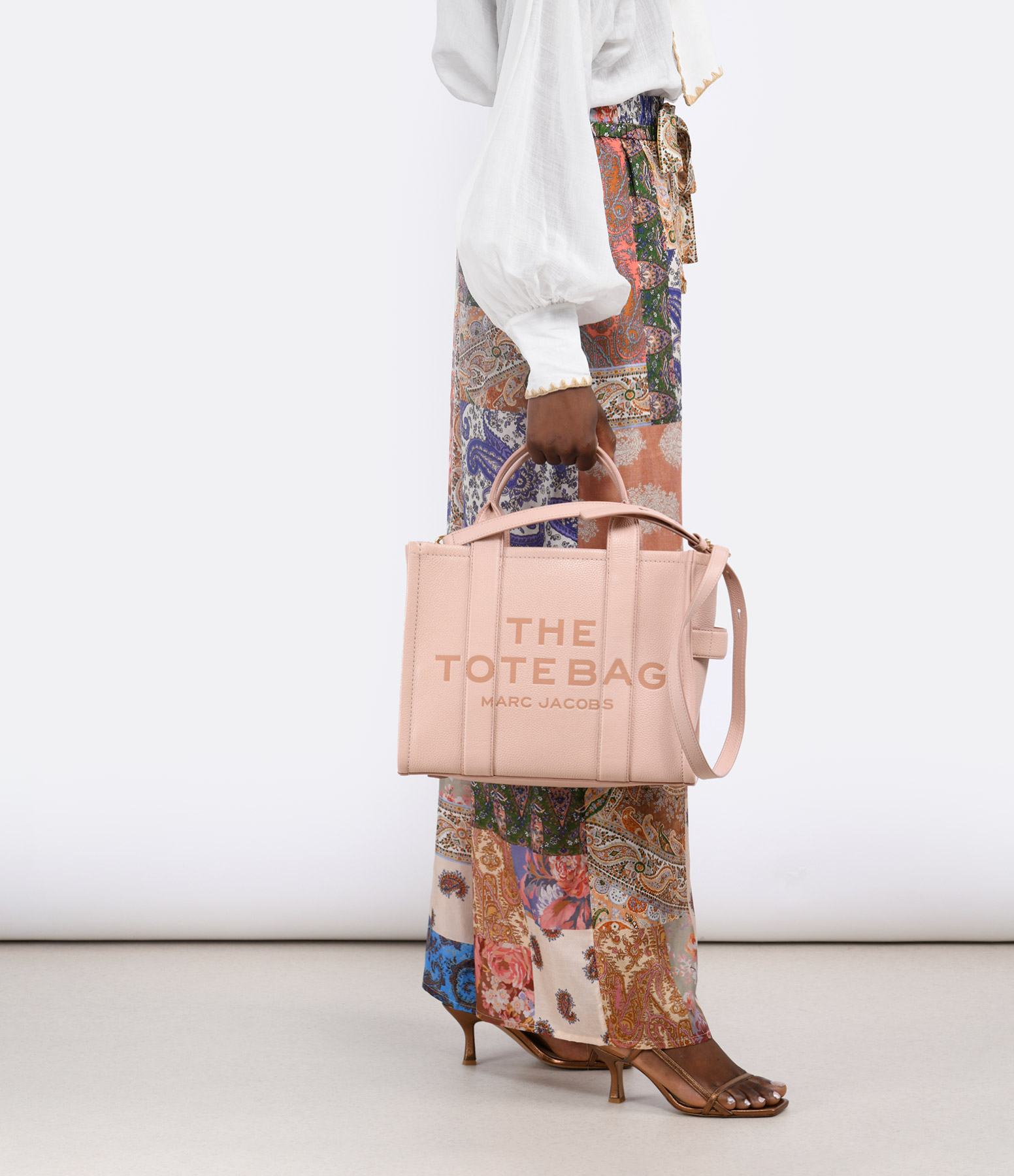 Petit sac cabas en cuir grainé rose pâle. Inscription "THE TOTE BAG MARC JACOBS" embossée à l'avant. Deux anses et une bandoulière ajustable et amovible par mousqueton. Fermeture zippée doré. Un patch en cuir cousu dans le dos avec l'inscription "MARC JACOBS STYLE : THE TOTE BAG LOCATION : N.Y.C. YEAR : 1984" embossée. Une anse sur le côté. À l'intérieur un grand compartiment avec une poche plaquée et un emplacement carte.