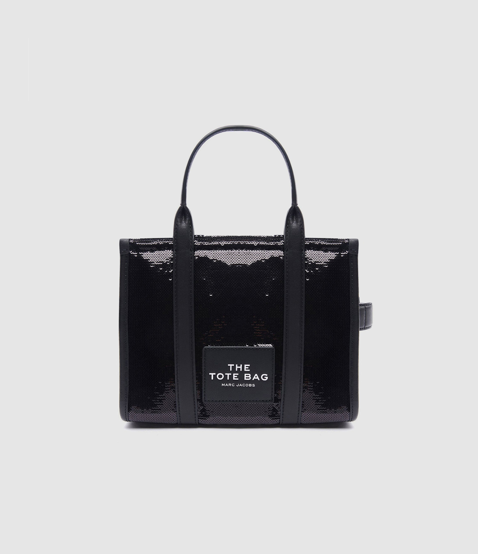 Mini sac cabas à sequins noirs. Deux anses et une bandoulière noire ajustable et amovible par mousqueton. Inscription "THE TOTE BAG MARC JACOBS" sérigraphiée en blanc sur le devant. Fermeture zippée. Une anse sur le côté. Intérieur organisé en un grand compartiment.