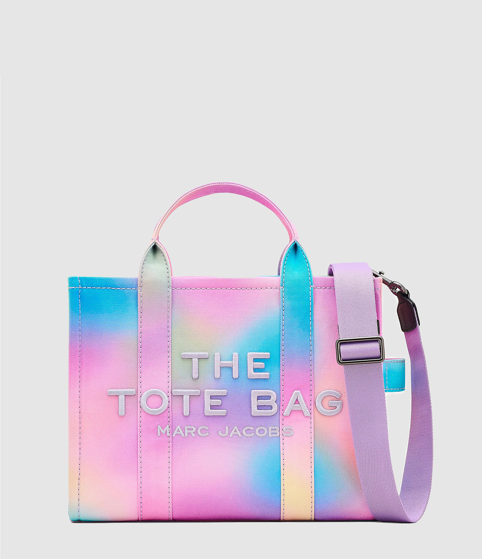 Tote Bag Small en toile dégradé multicolore. Logo "THE TOTE BAG MARC JACOBS". Fermeture zippée sur le dessus avec poignées en toile, et bandoulière amovible tissée réglable.