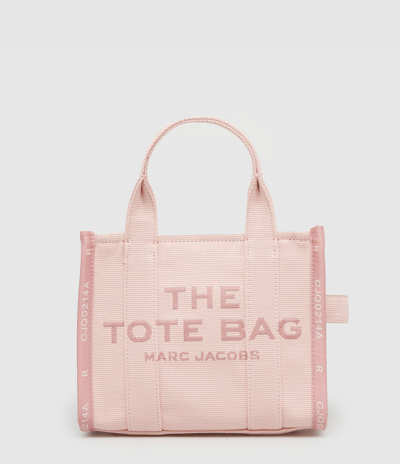 Mini sac cabas en jacquard de coton rose. Deux anses et une bandoulière amovible et ajustable par mousqueton. Inscription "THE TOTE BAG MARC JACOBS" tissée sur le devant. Un patch cousu dans le dos avec l'inscription "MARC JACOBS STYLE : THE TOTE BAG LOCATION : N.Y.C. YEAR : 1984" brodée. Une anse sur le côté. Intérieur organisé en un grand compartiment avec une poche zippée et deux poches plaquées. Un patch avec l'inscription "THE MARC JACOBS" brodée sur une des poches plaquées intérieures.