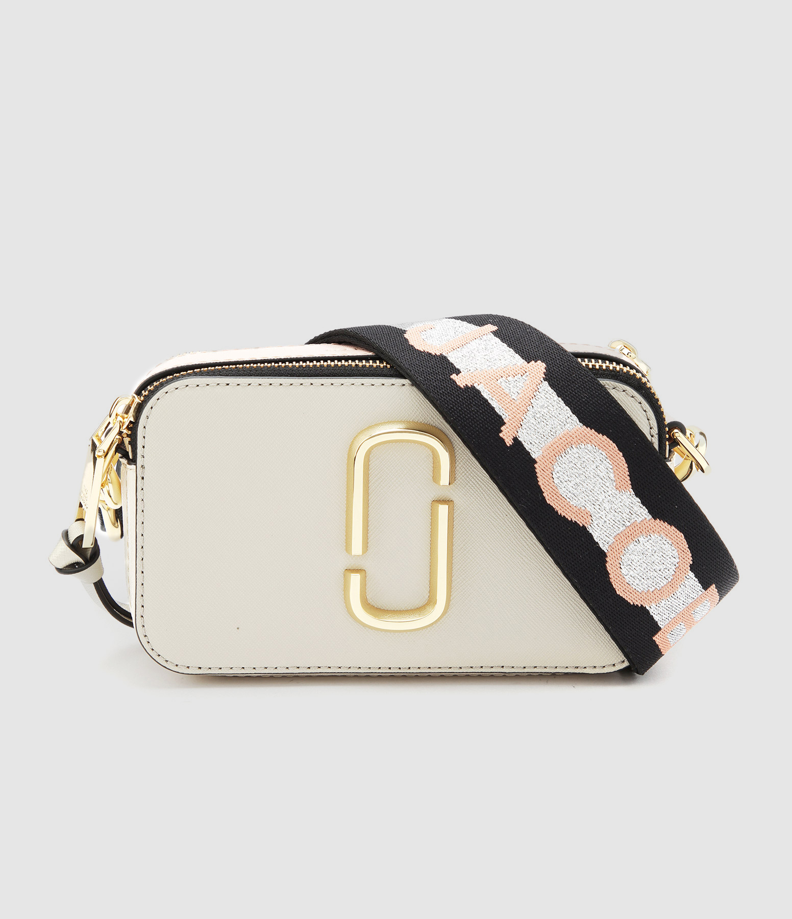 Sac bandoulière en cuir Saffiano vernis gris, beige et rose. Porté épaule ou croisé. Bandoulière noire avec l'inscription "THE MARC JACOBS" tissée sur une bande argentée, ajustable et amovible par mousqueton doré. Deux compartiments zippés doré dont un contenant une poche plaquée avec un patch en cuir gris cousu dessus embossé de l'inscription " THE SNAPSHOT MARC JACOBS". Plaque logo métallique dorée sur le devant.