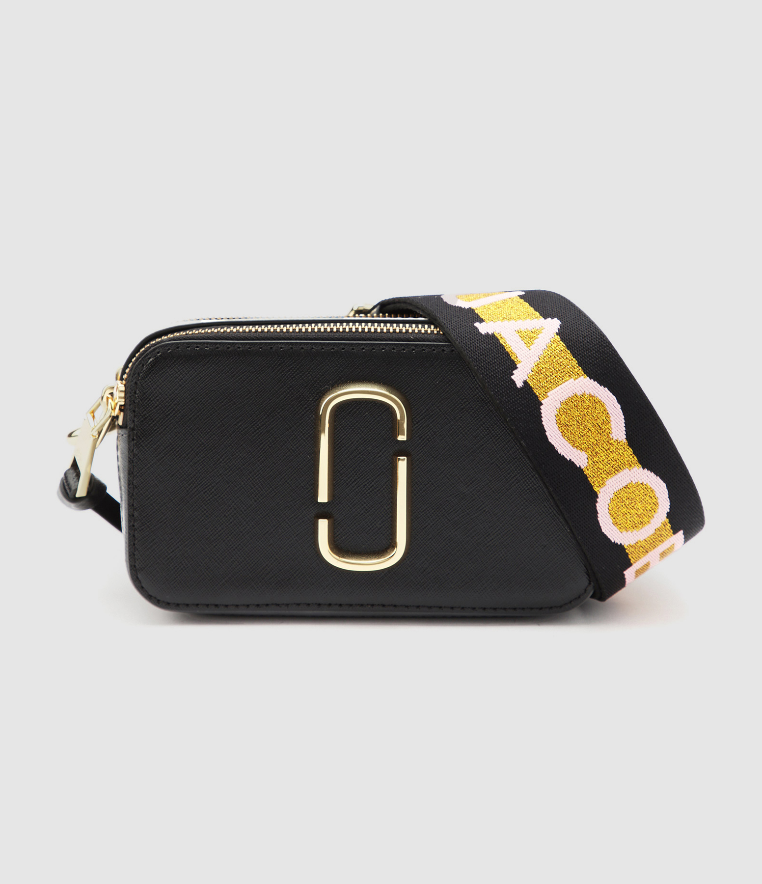 Sac bandoulière en cuir Saffiano vernis noir, gris et blanc. Porté épaule ou croisé. Bandoulière verte avec l'inscription "THE MARC JACOBS" tissée en rose sur une bande dorée, ajustable et amovible par mousqueton doré. Deux compartiments zippés doré dont un contenant une poche plaquée avec un patch en cuir noir cousu dessus embossé de l'inscription " THE SNAPSHOT MARC JACOBS". Plaque logo métallique dorée sur le devant.