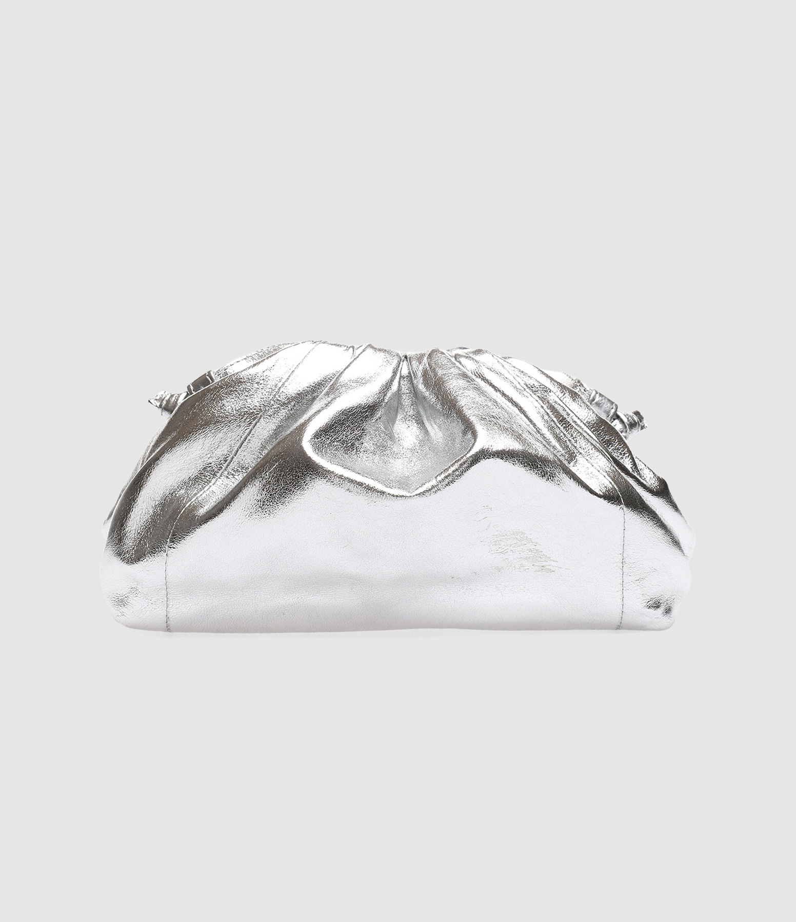 Sac bandoulière souple en cuir argenté. Une poche plaquée à l'intérieur. Fermeture par aimant.