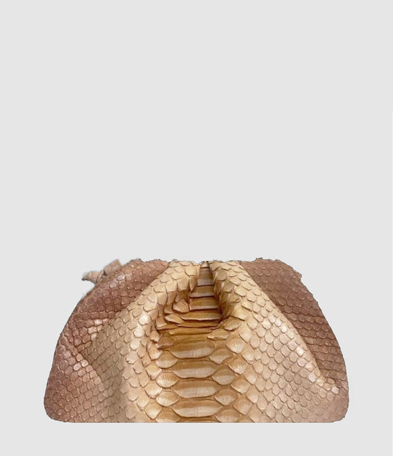 Sac bandoulière souple en python marron. Une poche plaquée à l'intérieur. Fermeture par aimant. Bandoulière pour un porté épaule ou cross body.