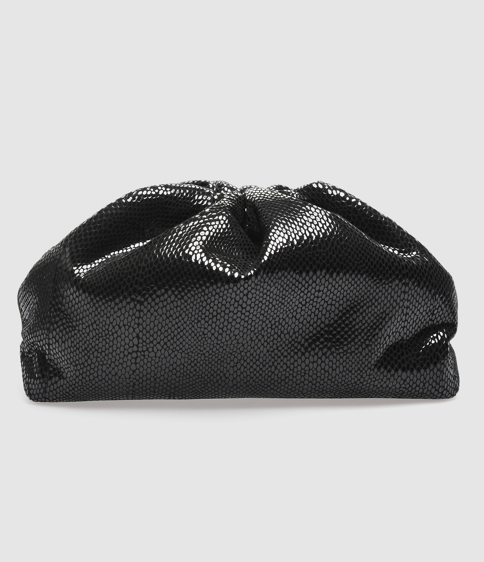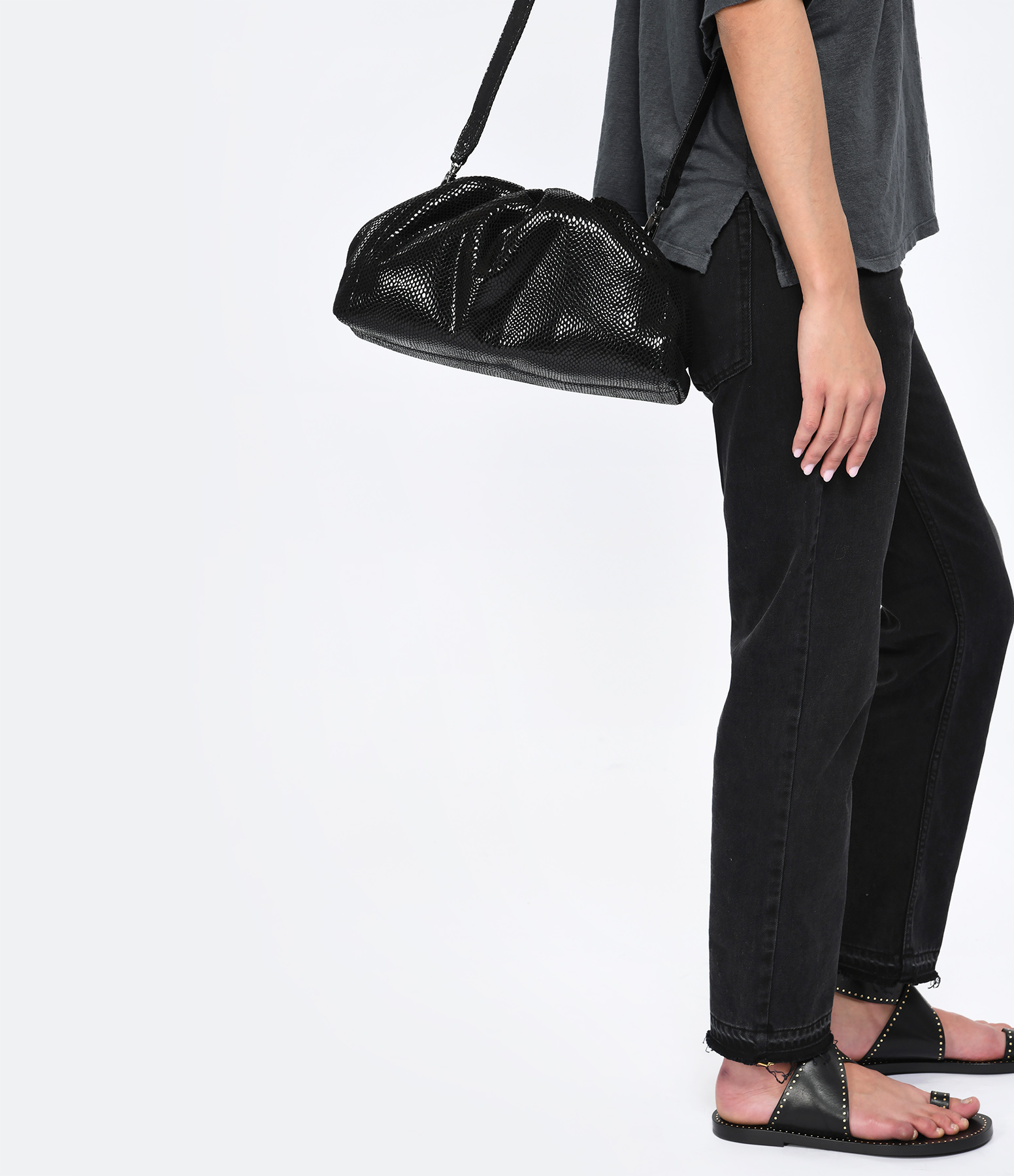Sac souple en cuir effet écaille noir avec bandoulière amovible. Une poche plaquée à l'intérieur. Fermeture par aimant.