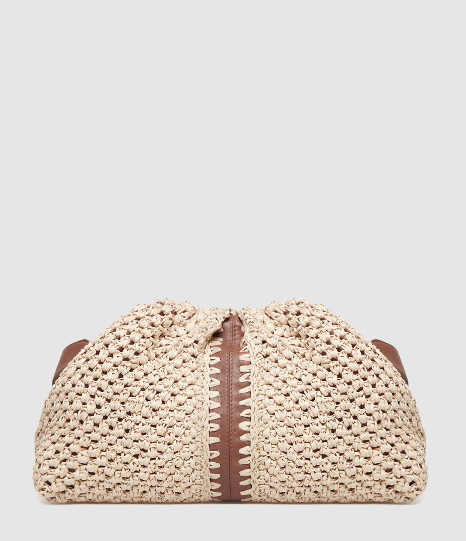 Pochette souple en raphia et empiècement cuir, avec doublure intérieure en coton et fermeture magnétique. Compartiment unique avec petite poche. Bandoulière en cuir.