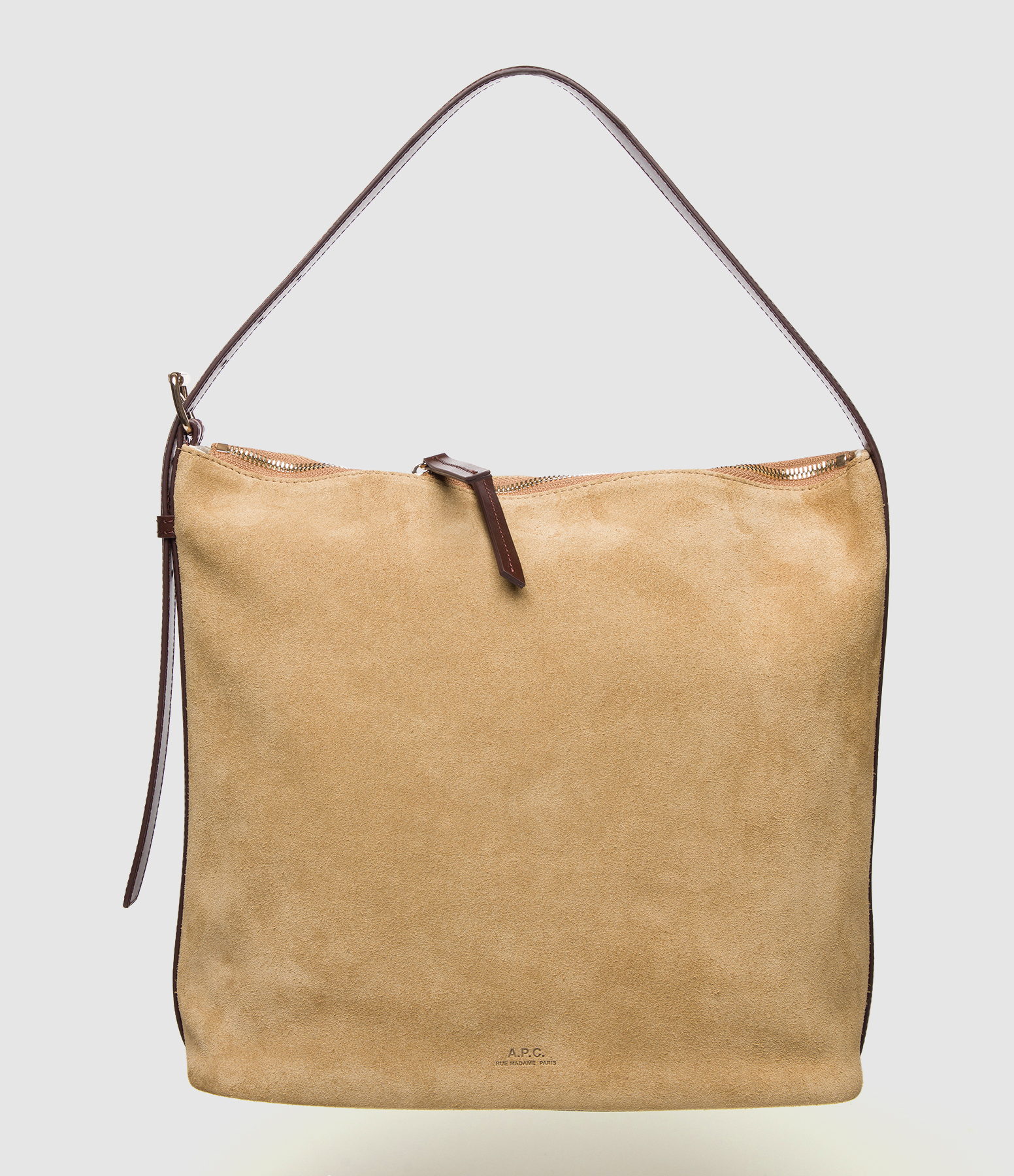 Sac en cuir suédé beige, porté main ou épaule grâce à une bandoulière ajustable en cuir marron. Fermeture à zip doré. Compartiment unique et poche plaquée intérieure.