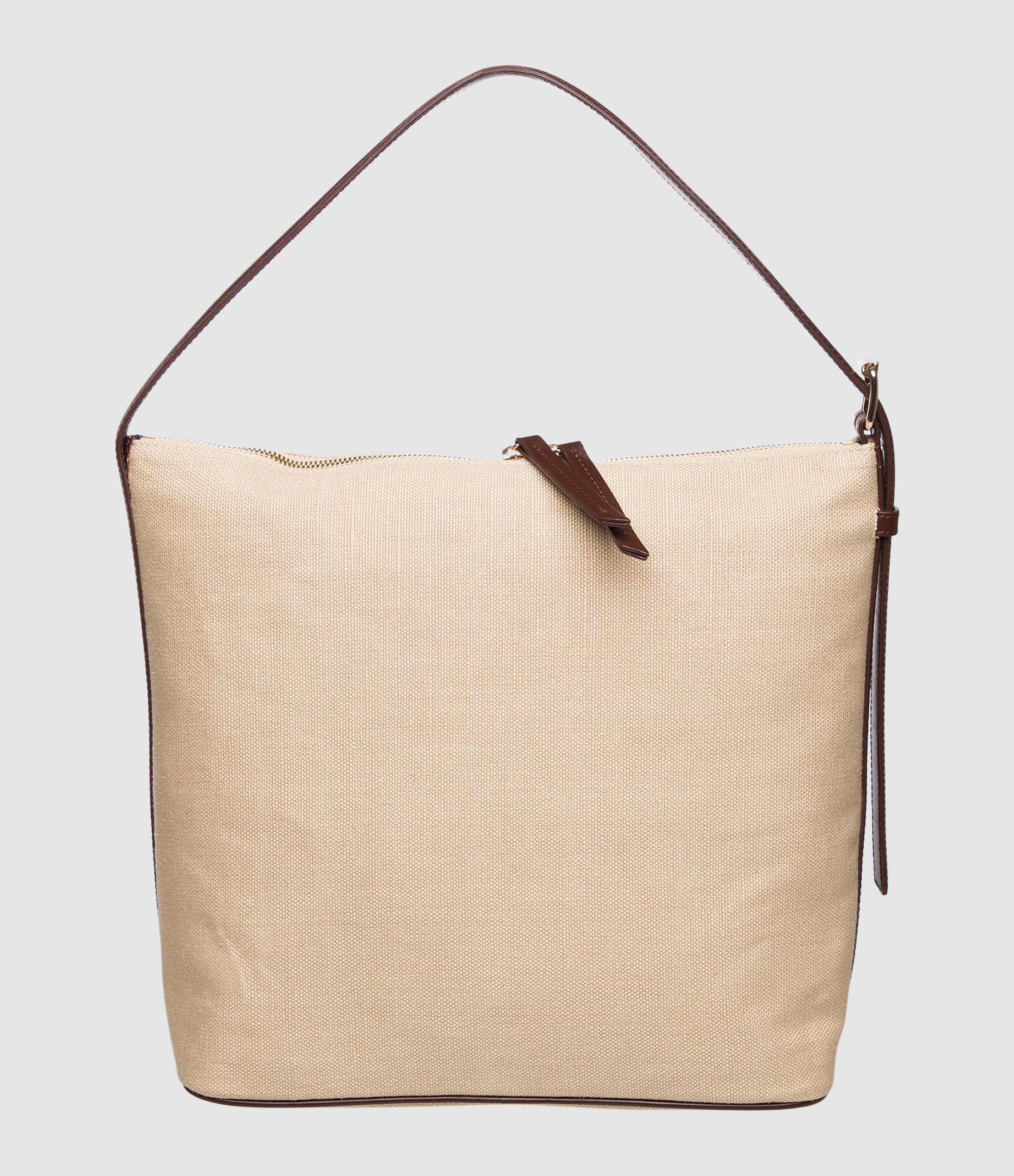 Sac en lin beige, porté main ou épaule grâce à une bandoulière ajustable en cuir marron. Fermeture à zip doré. Compartiment unique et poche plaquée intérieure.
