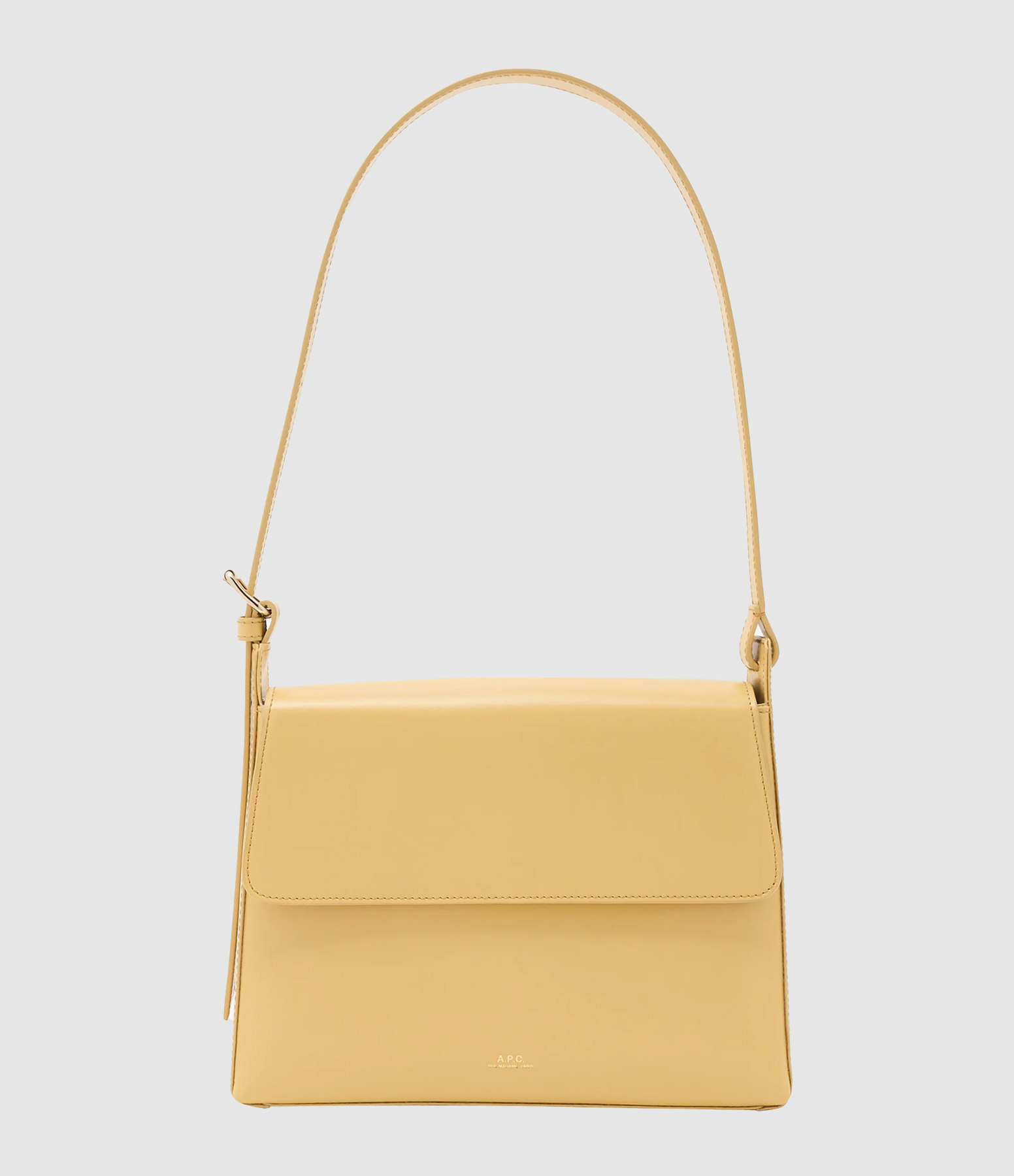 Sac en cuir jaune avec surpiqûres ton sur ton et logo doré A.P.C. Rue Madame Paris embossé à l’avant. Porté main ou épaule grâce à une bandoulière ajustable à boucle métallique dorée. Fermeture à rabat avec fermoir aimanté. Intérieur doublé en coton, compartiment unique avec une poche plaquée. Poche plaquée supplémentaire au dos.