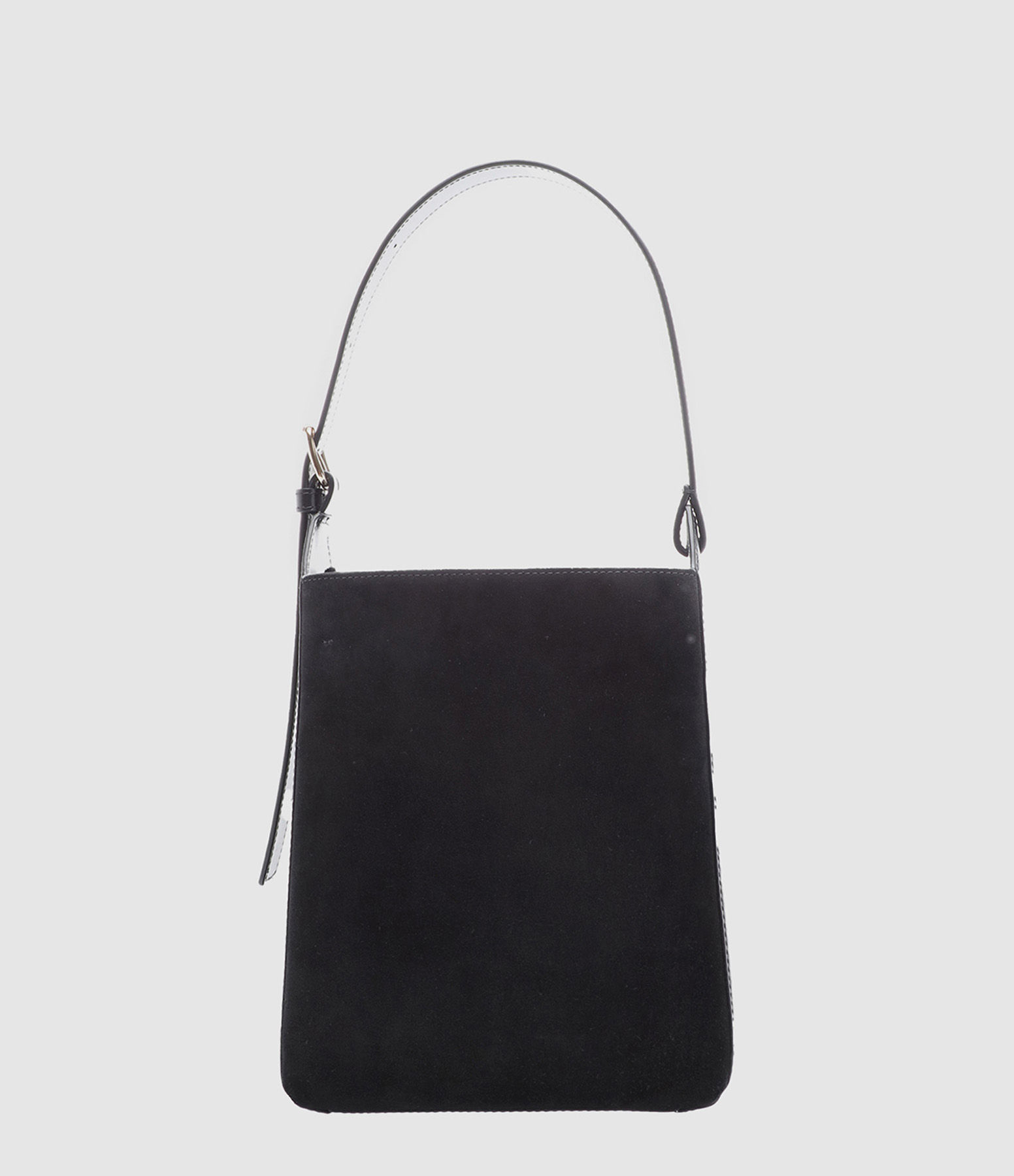 Sac seau en cuir suédé noir sur les faces et cuir lisse noir sur les cotés. Intérieur organisé dans un pochon amovible avec cordon de serrage. Logo embossé doré "A.P.C Rue Madame Paris" sur l'extérieur. Une anse en cuir lisse mat réglable pour un porté main et une grande bandoulière amovible par mousquetons dorés et réglable. Doublé en coton.