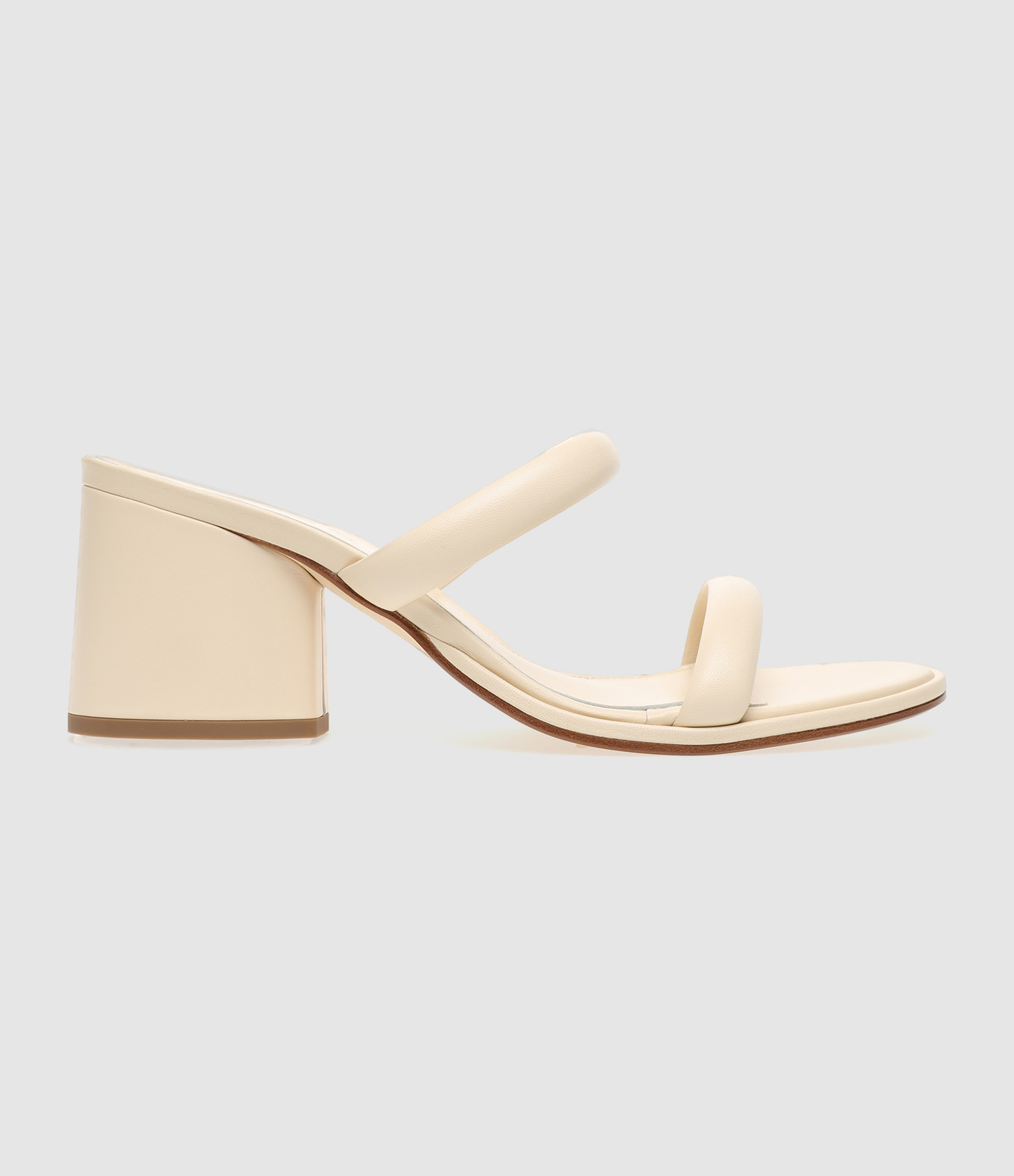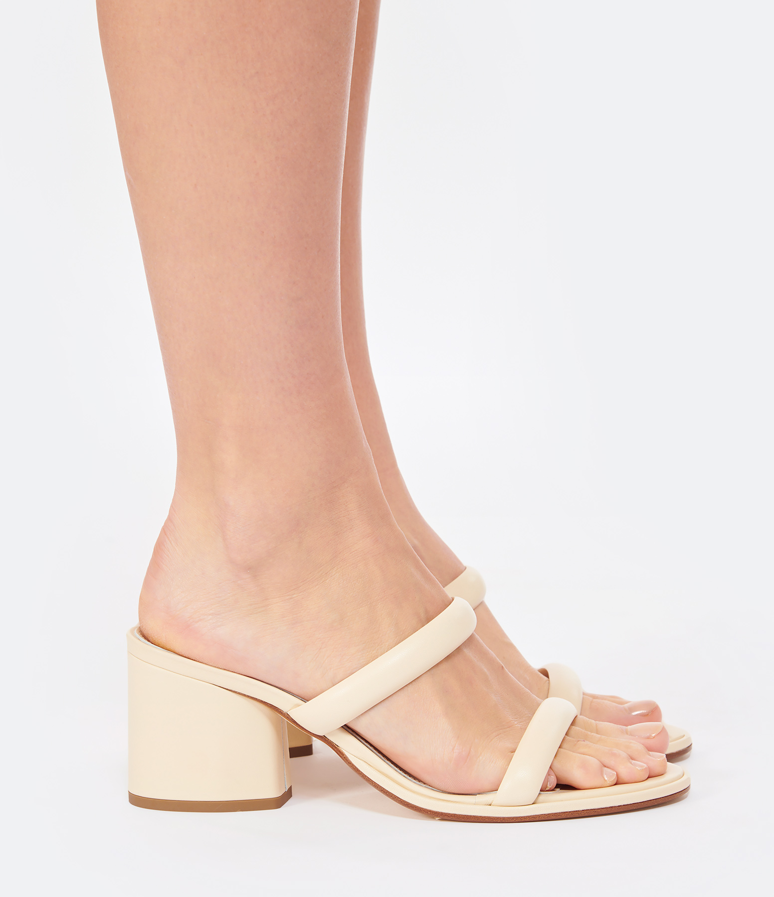 Sandales à talons en cuir crème. Deux brides sur le dessus.