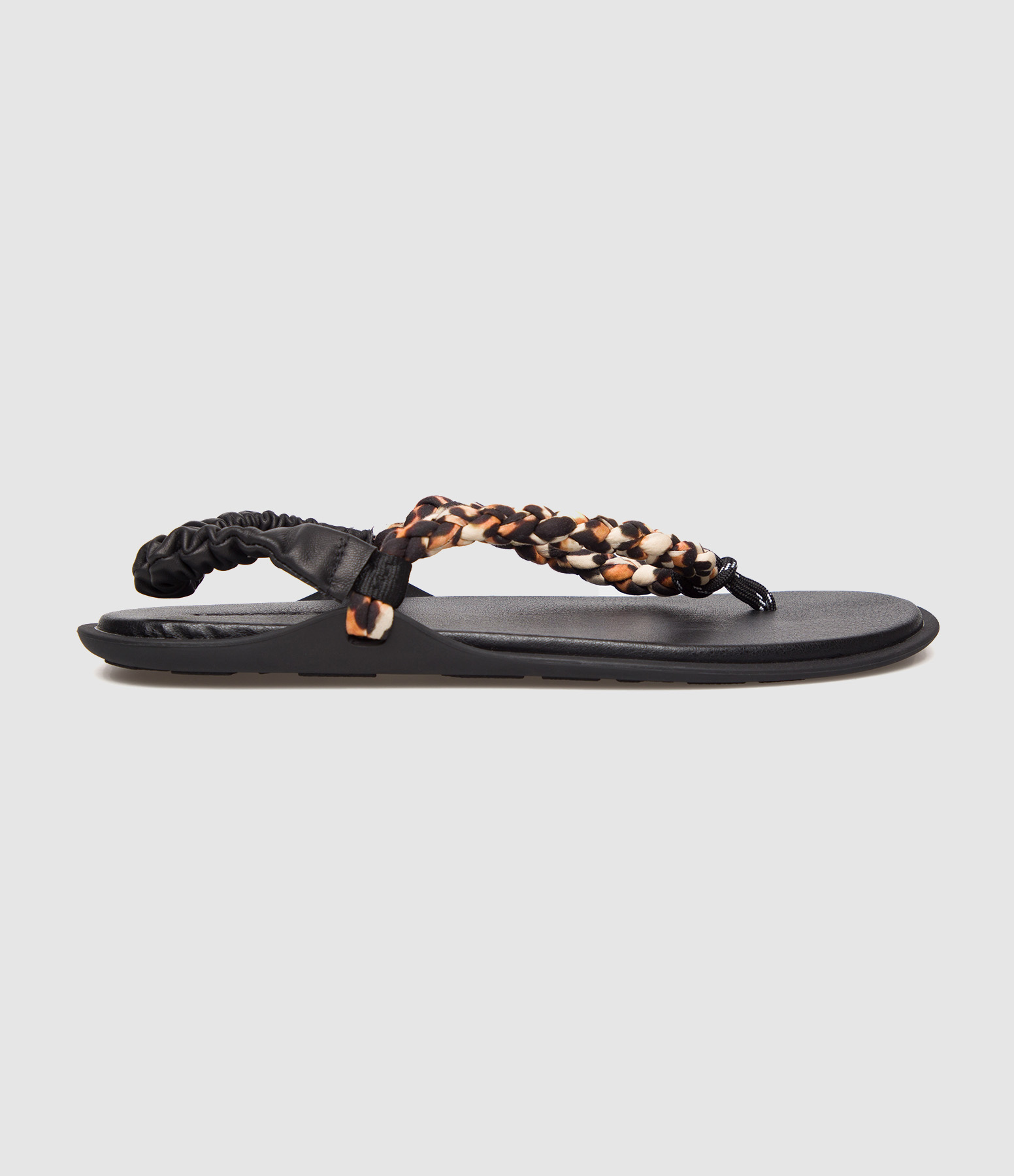 Sandales plates, maintien avec brides tressées imprimé léopard et bride arrière en cuir.