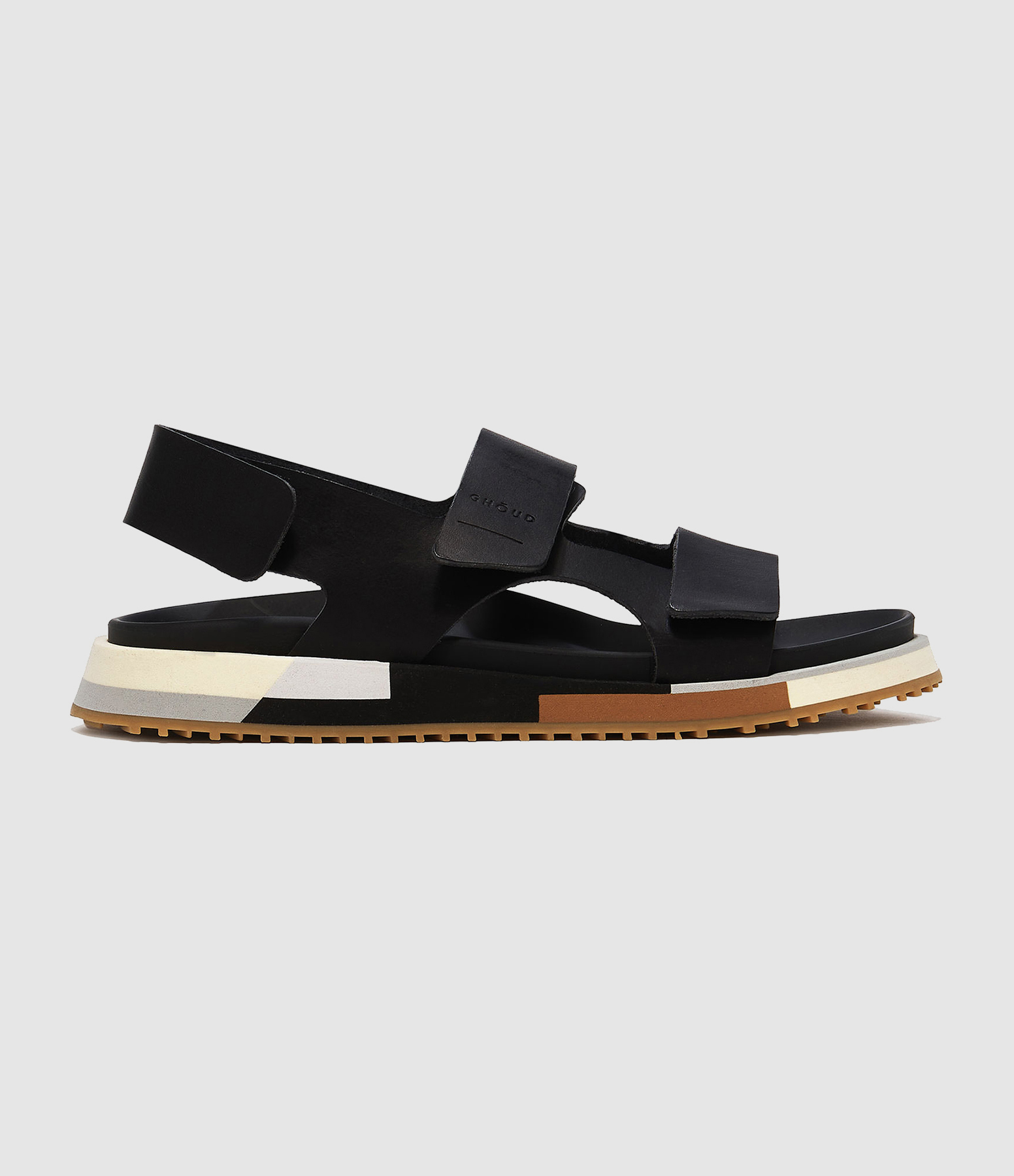 Sandales en cuir noir à bride large. Semelle tricolore crantée. Fermeture par scratch. Lit de pied anatomique en caoutchouc.