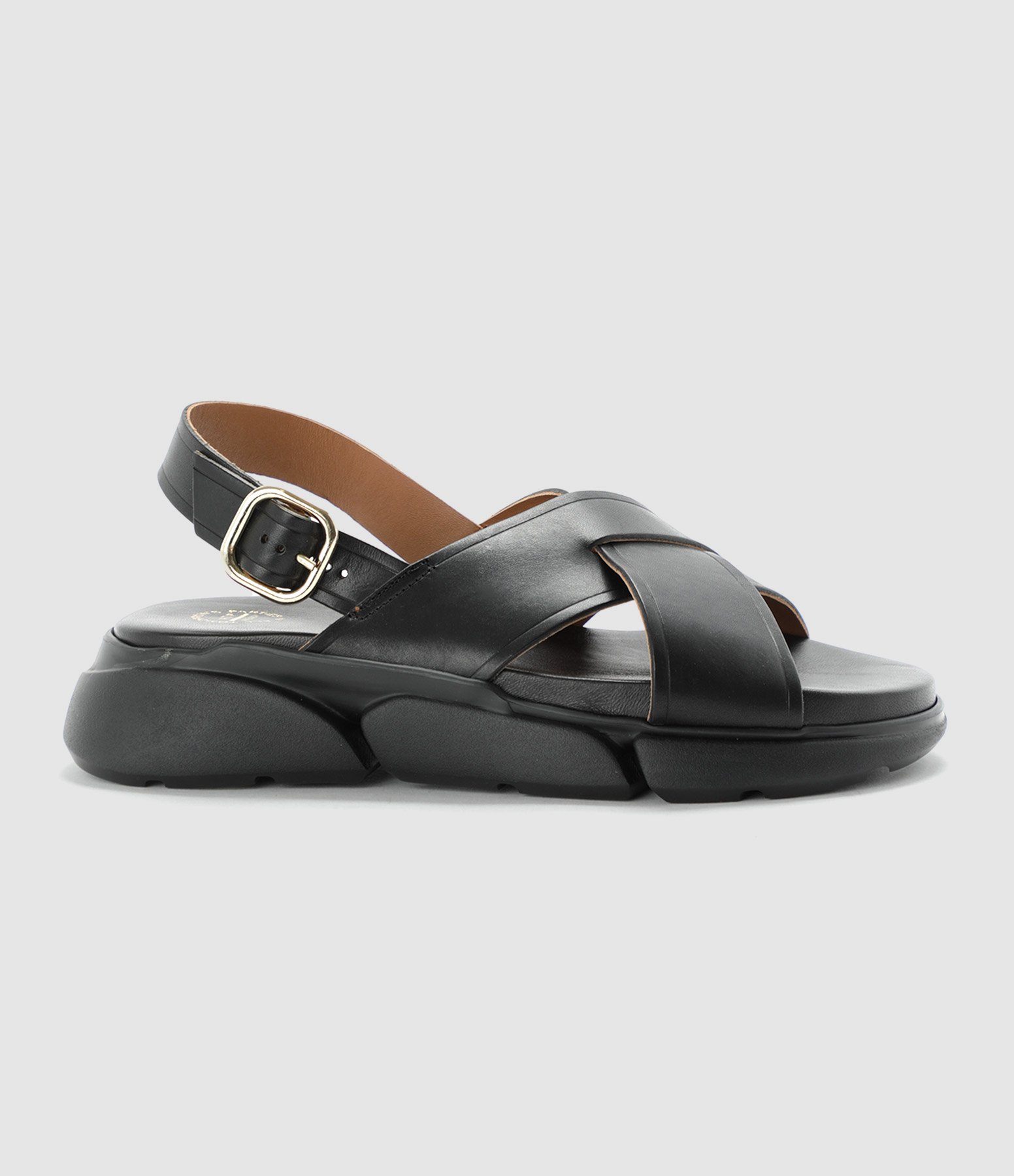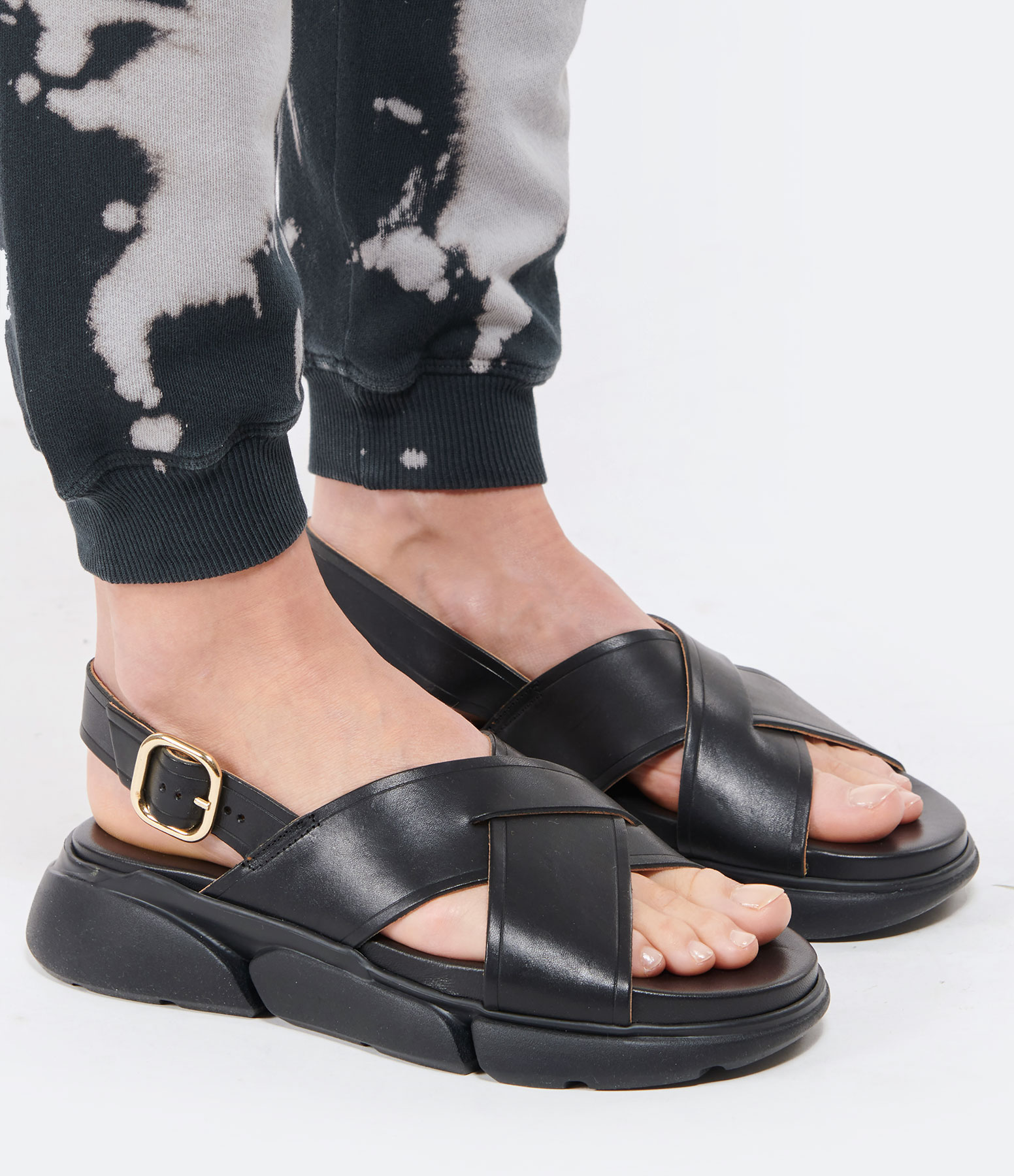 Sandales à larges semelles, deux brides croisées sur le pieds. Bouts ronds. Fermoir par boucle métallique. Semelle en cuir.