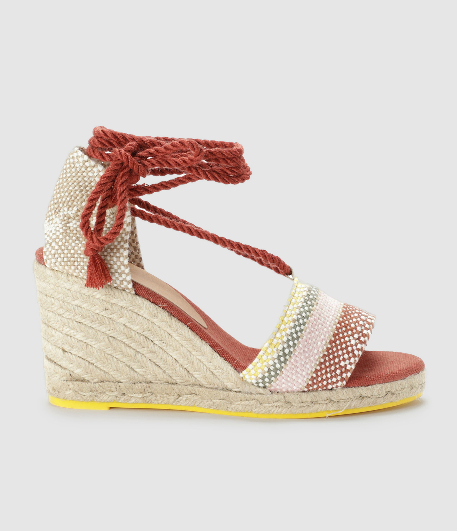 Espadrilles en toile rayées multicolore. Semelle compensée en fil de jute et coton. Rubans à nouer autour de la cheville.