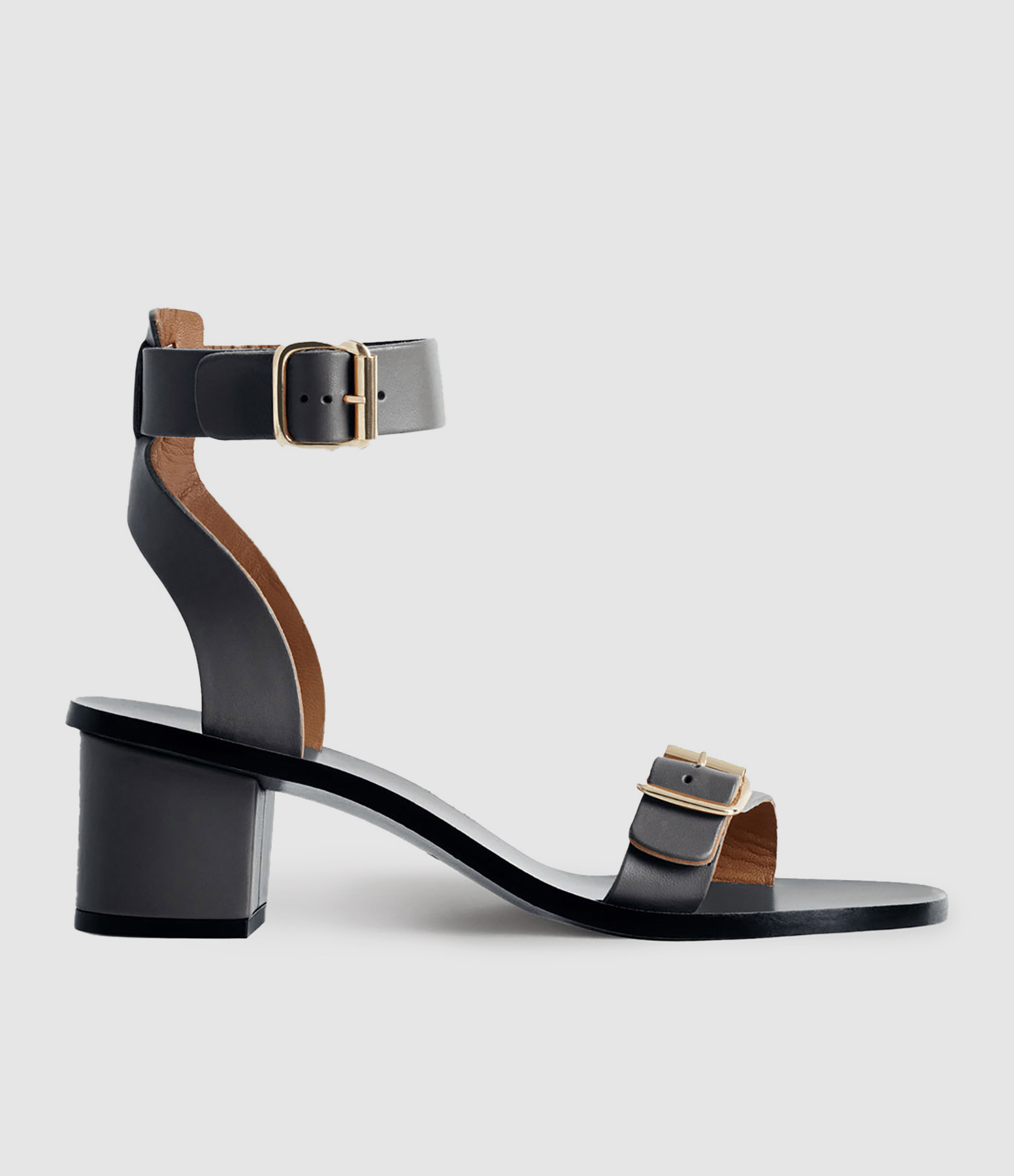 Sandales à talons avec brides dorés réglables à l'avant et au niveau de la cheville. Talon carré. Semelles en cuir.