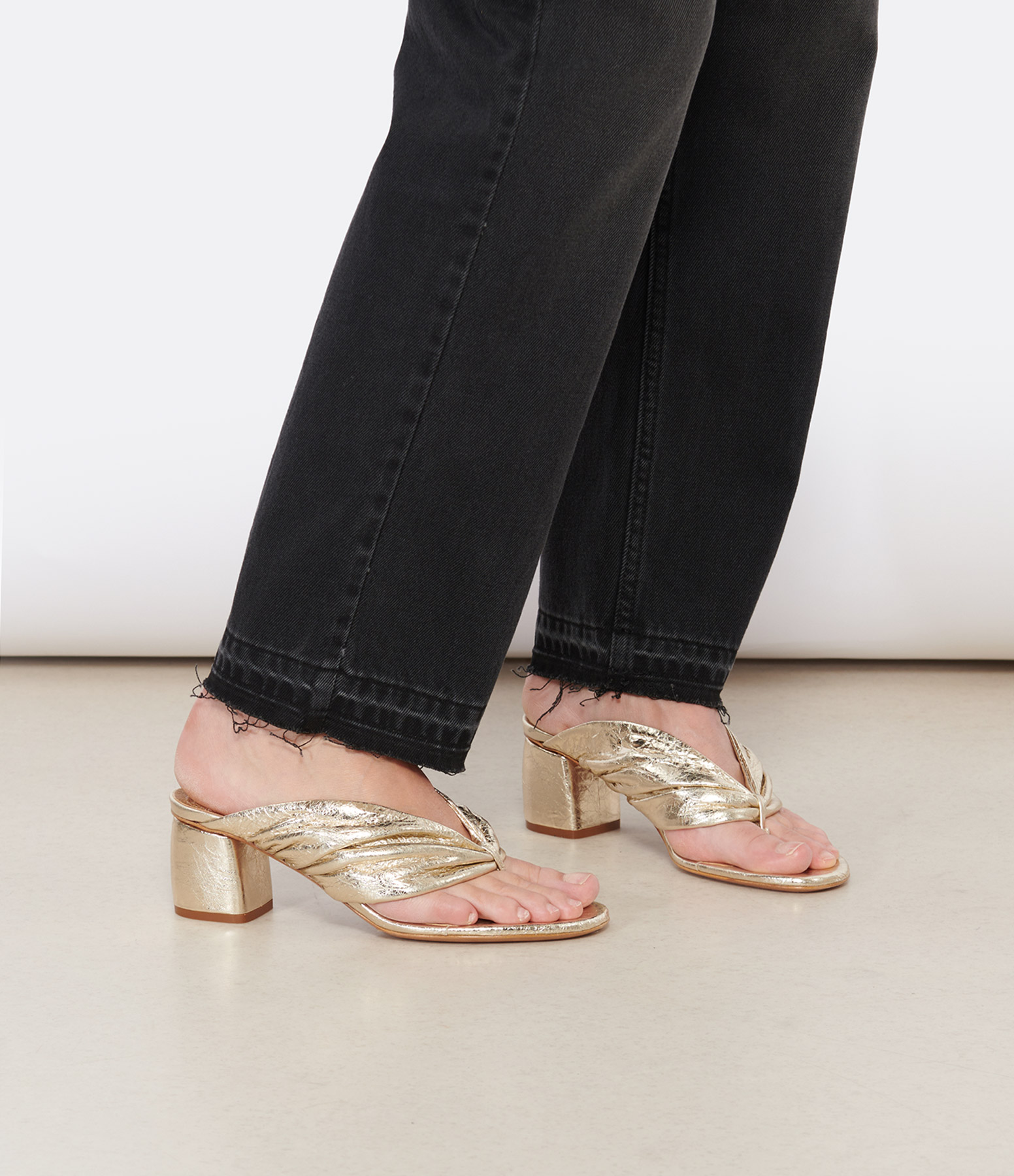 Sandales dorées en cuir de veau lamé craquelé. Talons carrés. Détail de bande drapée.