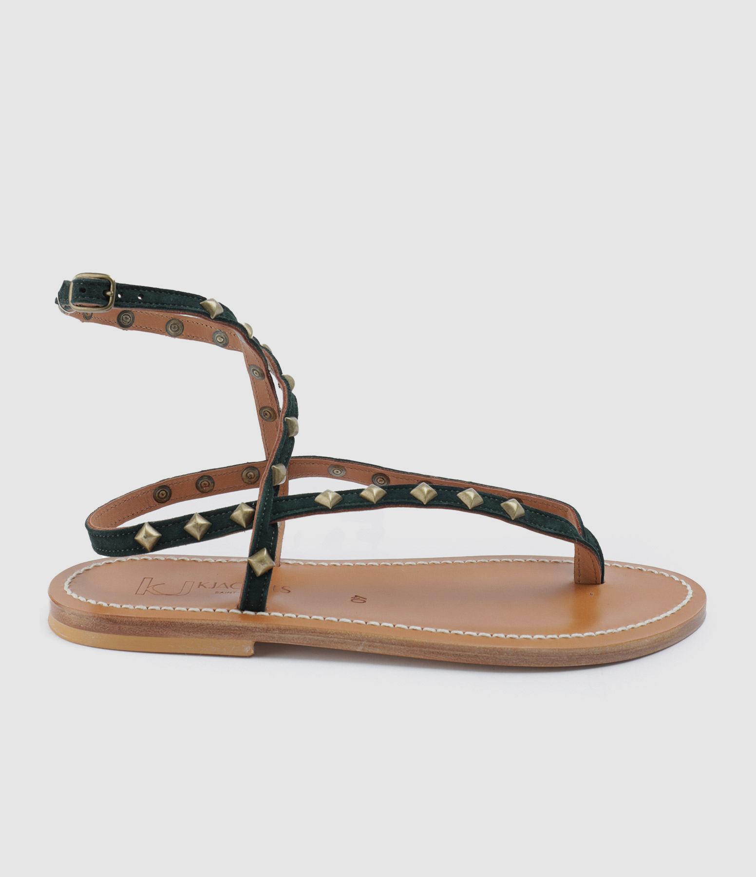 Sandales en cuir ornées de clous. Double bride réglable autour de la cheville.