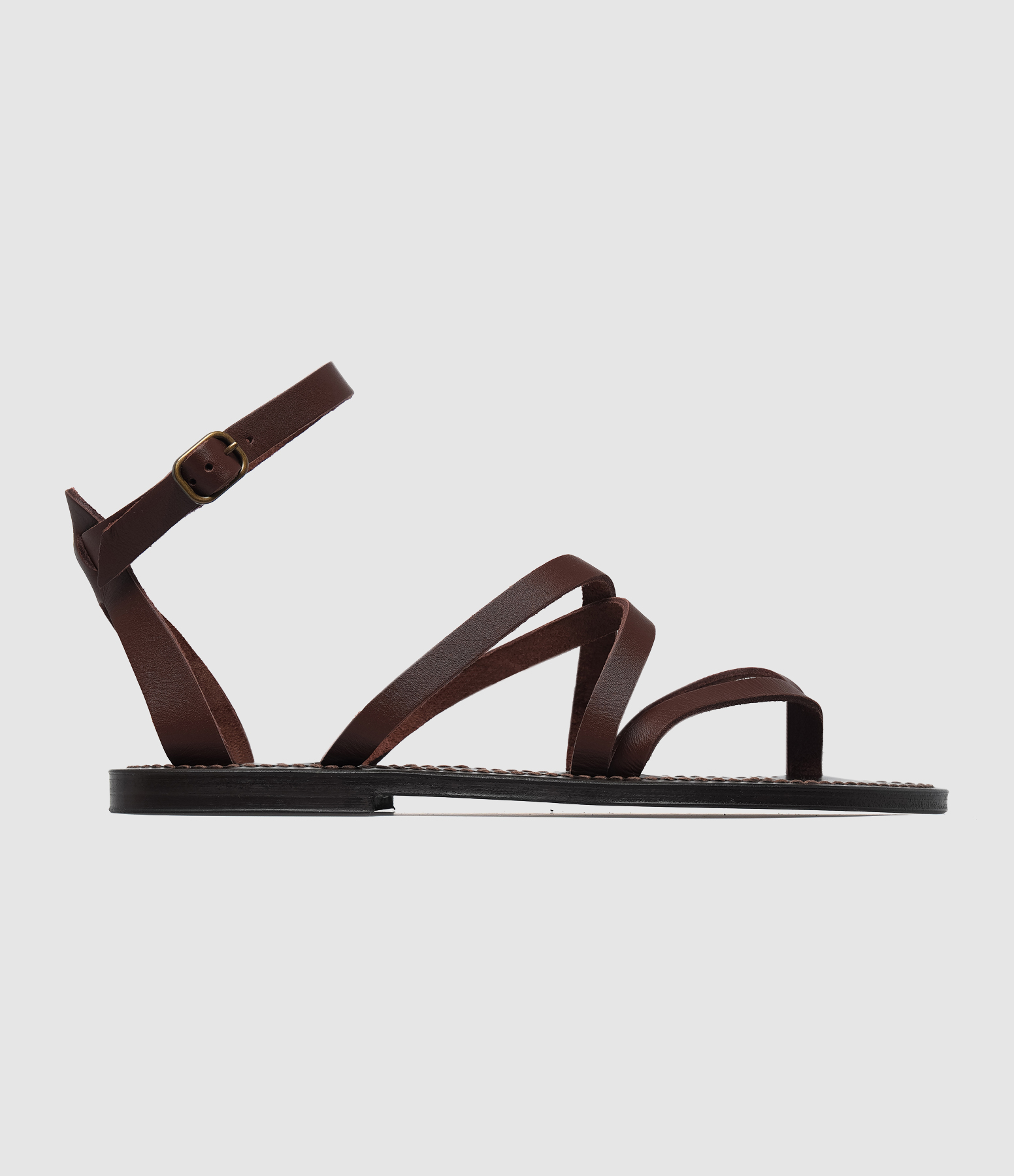 Sandales en cuir marron. Brides à l'avant et une réglable à attacher autour de la cheville.