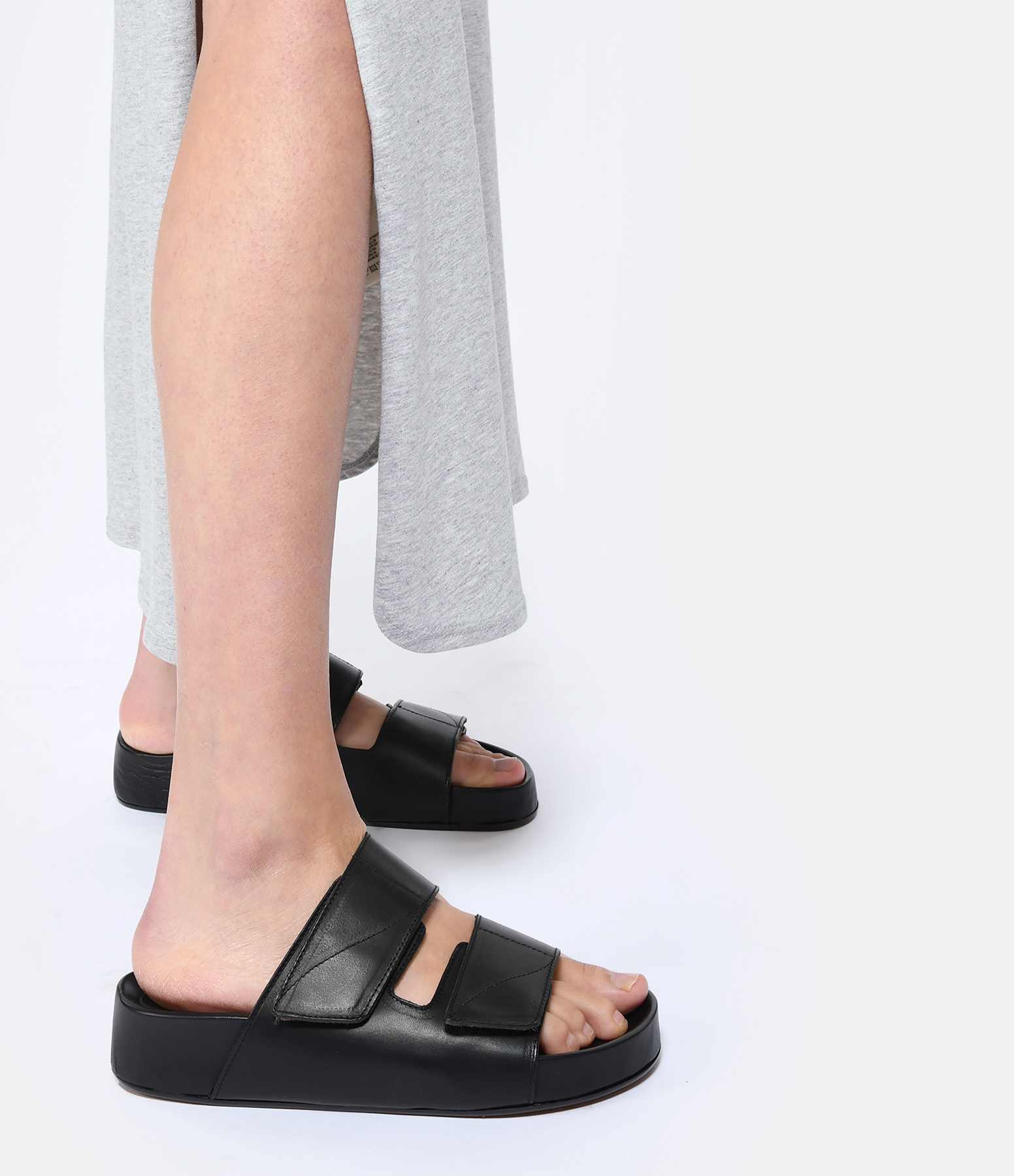 Sandales noires à scratch. Ouvertes à l'arrière. Semelle en cuir.