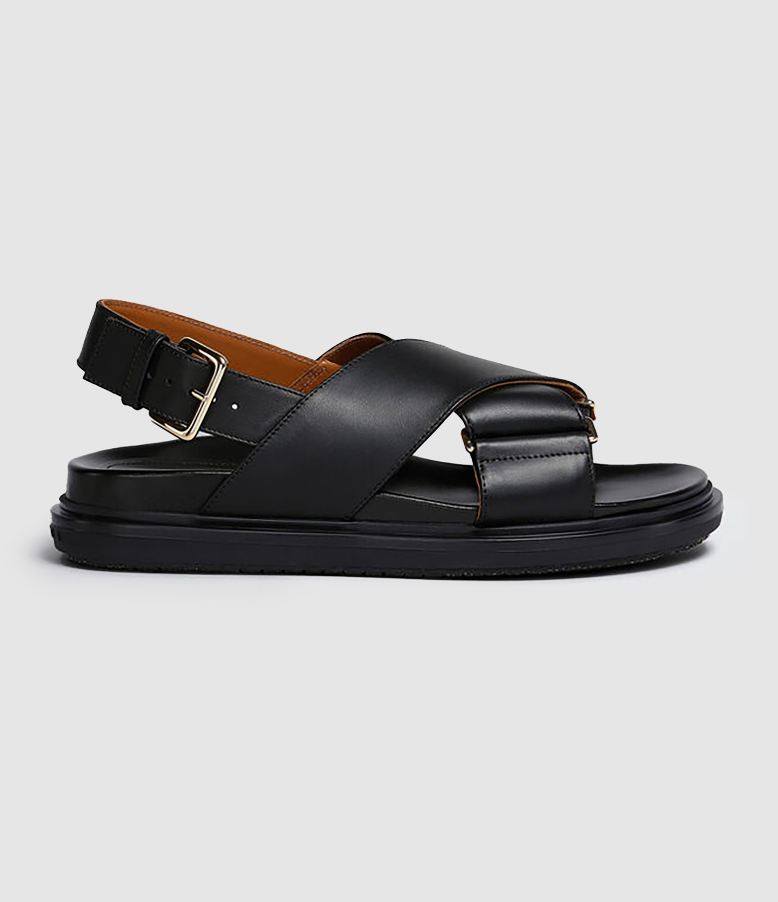 sandales en cuir lisse noir. Brides croisées sur le devant. Bride réglable à l'arrière. Finitions métalliques dorées. Semelle intérieure en cuir avec le logo Marni embossé sur le talon. Semelle extérieure en caoutchouc.