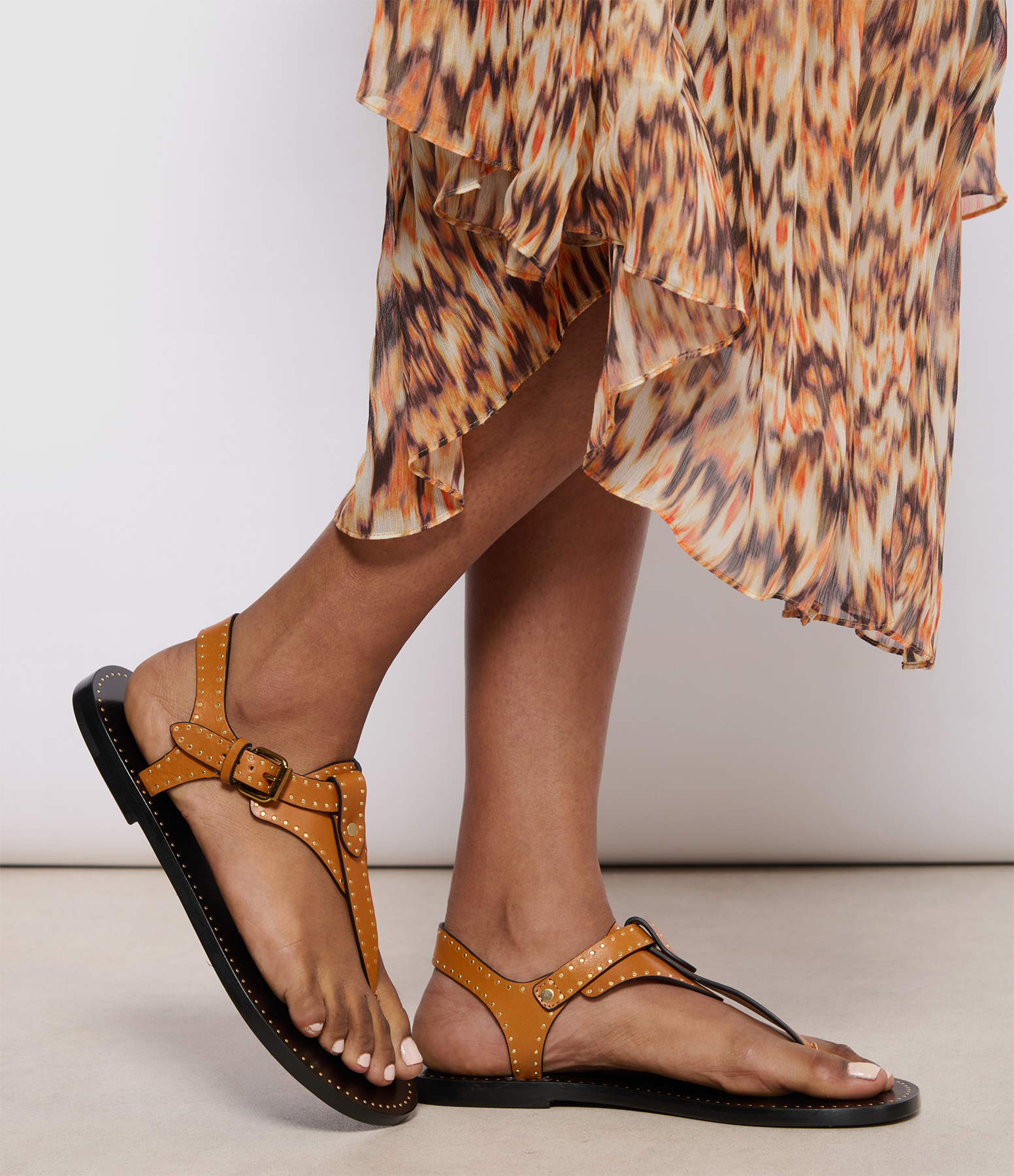 Sandales plates en cuir marron avec petits clous dorés et passant entre les orteils. Boucle en métal dorée.