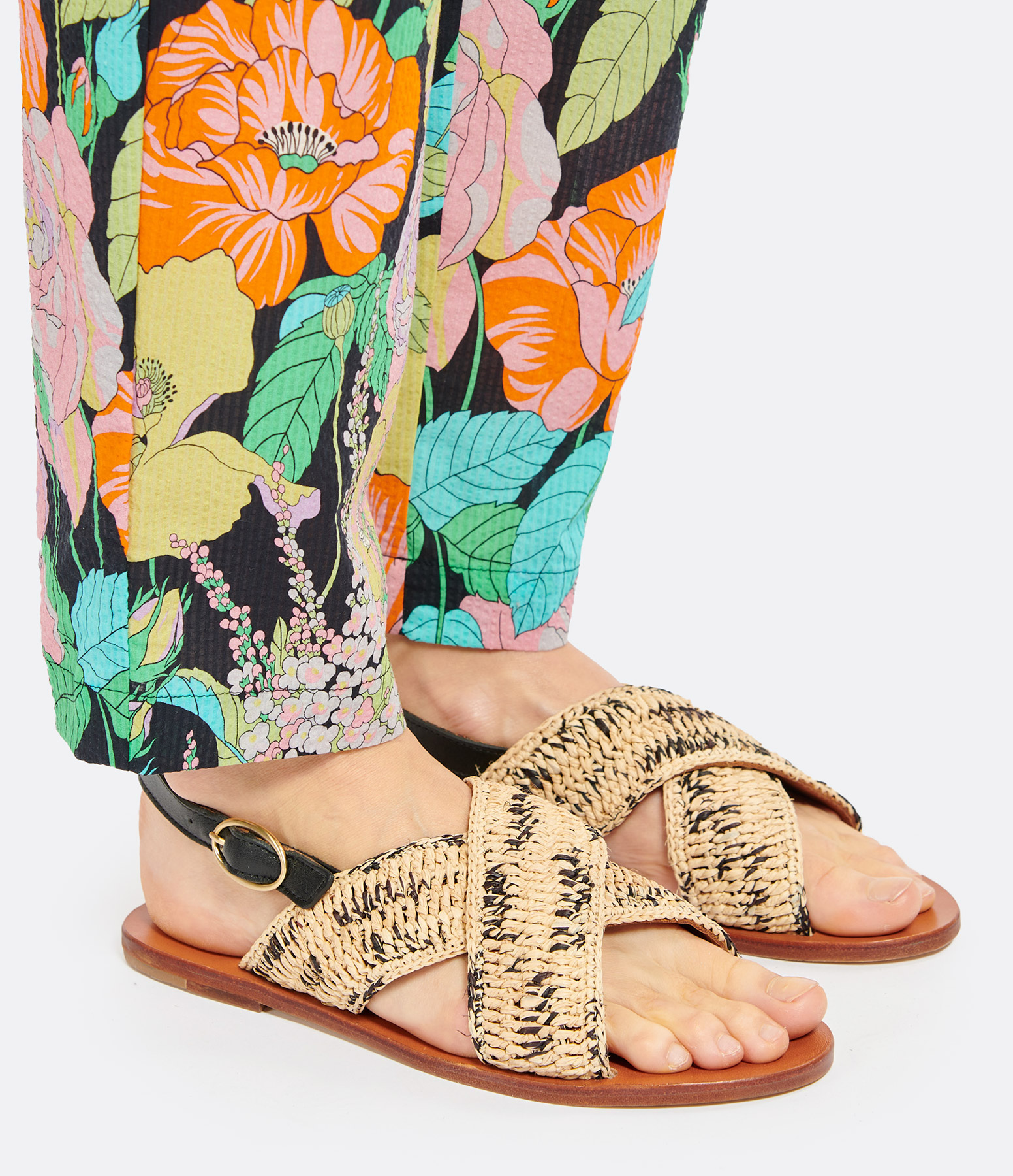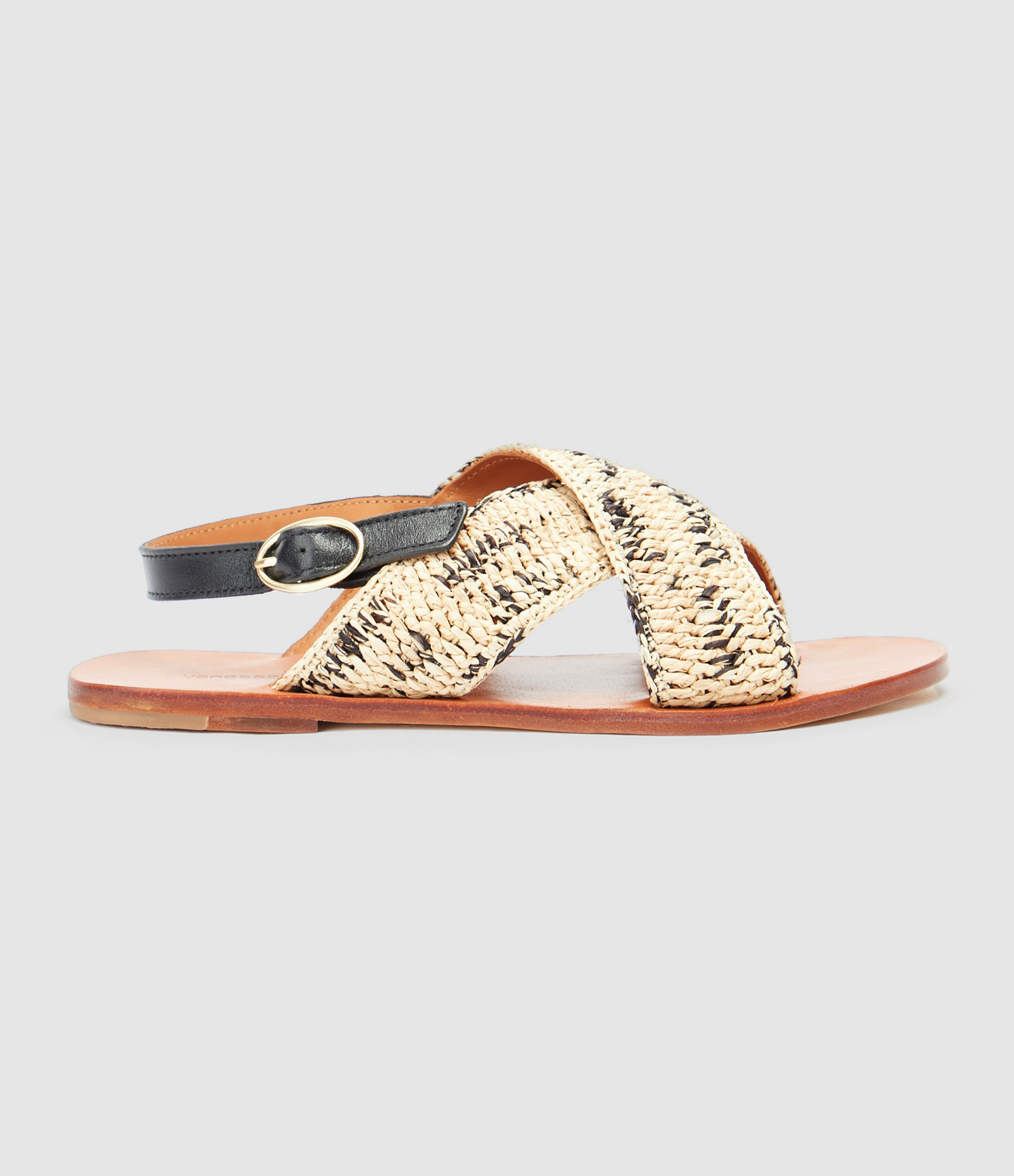 Sandales plates en raphia beige et noir. Bride en cuir noir avec boucle ajustable entourant l'arrière de la cheville. Semelles en cuir.