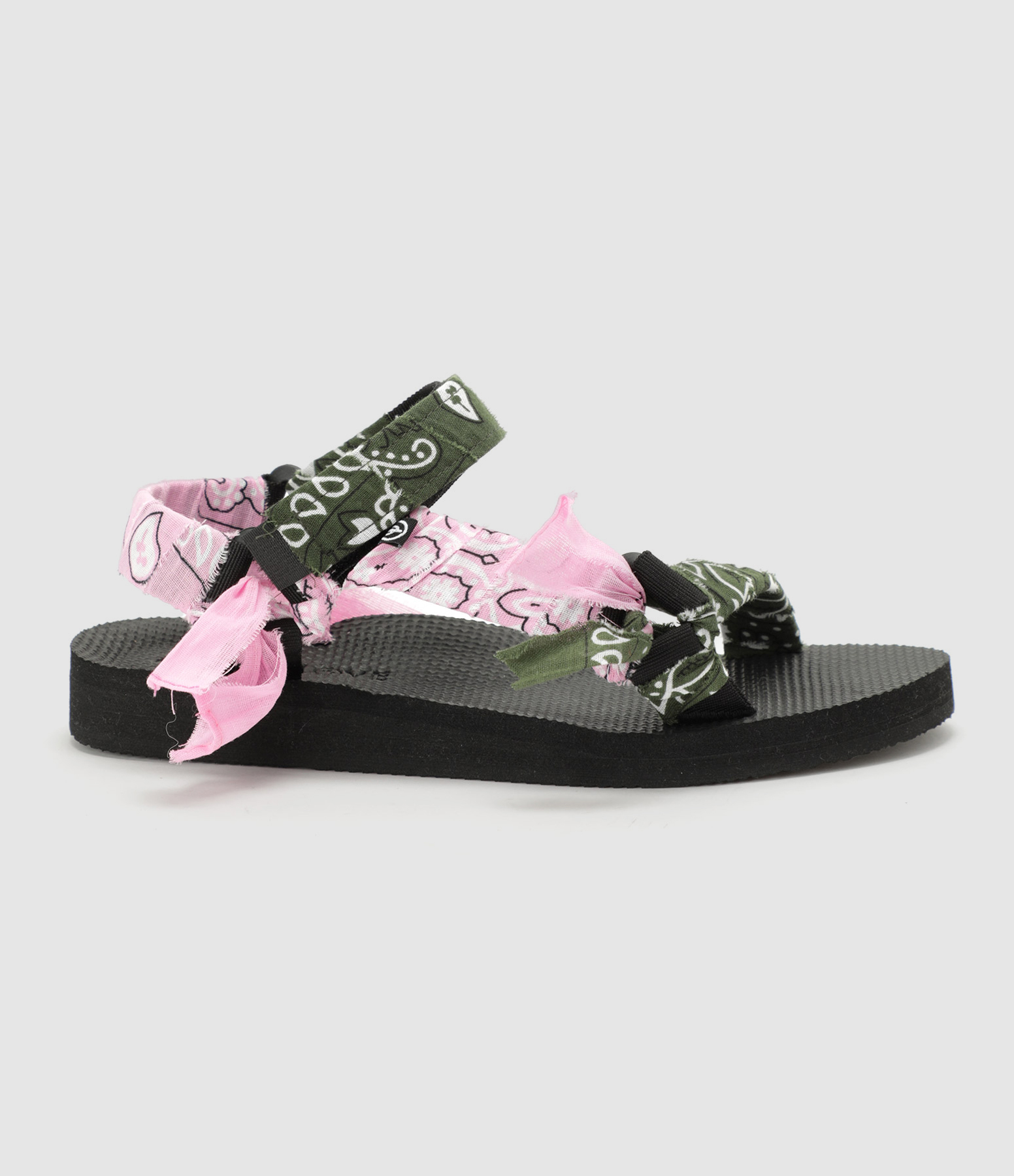 Sandales à brides enroulées de bandana rose et kaki coupé à cru. Nœuds décoratifs. Attache à scratch autour de la cheville. Semelle en mousse recyclée.