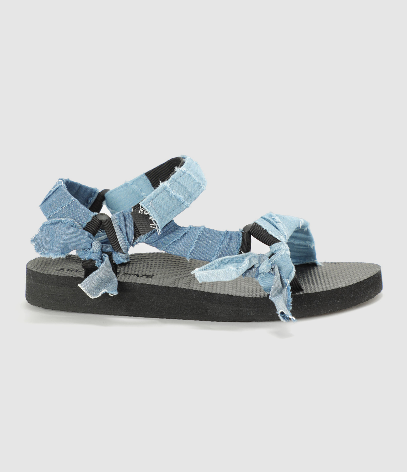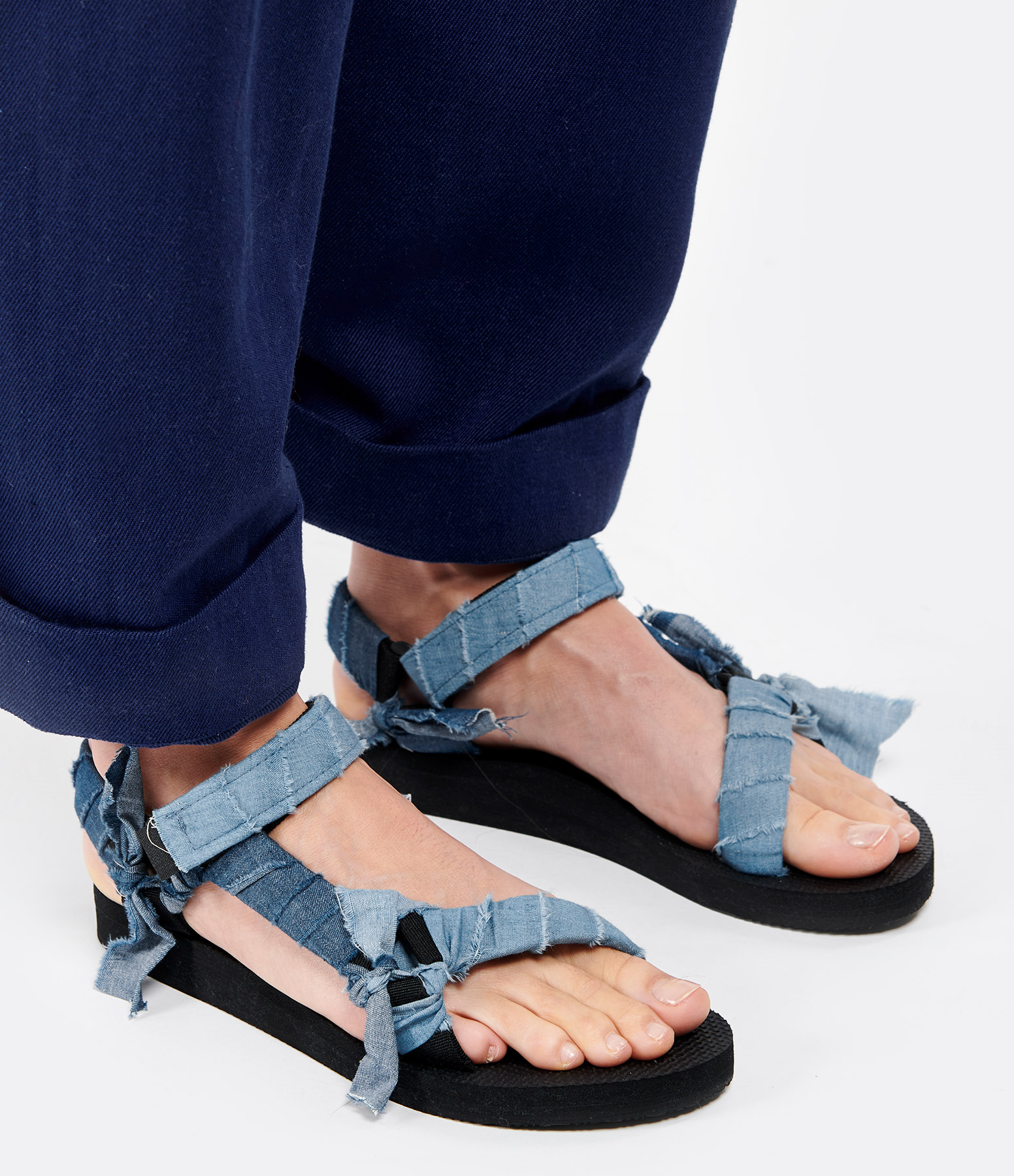 Sandales à brides enroulées denim bleu coupé à cru. Nœuds décoratifs. Attache à scratch autour de la cheville. Semelle en mousse recyclée.