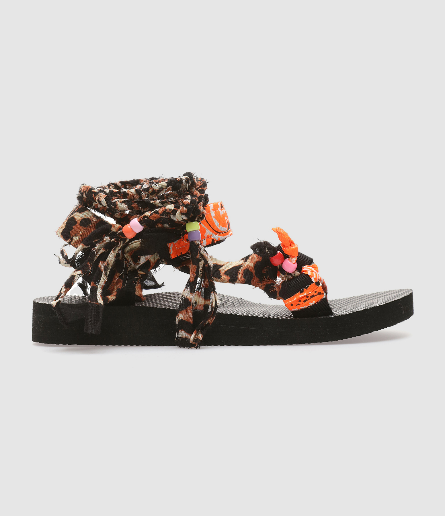 Sandales à brides enroulées de tissus imprimé bandana orange fluo et léopard. Attache à scratch et liens à nouer autour de la cheville. Semelle en mousse recyclée.