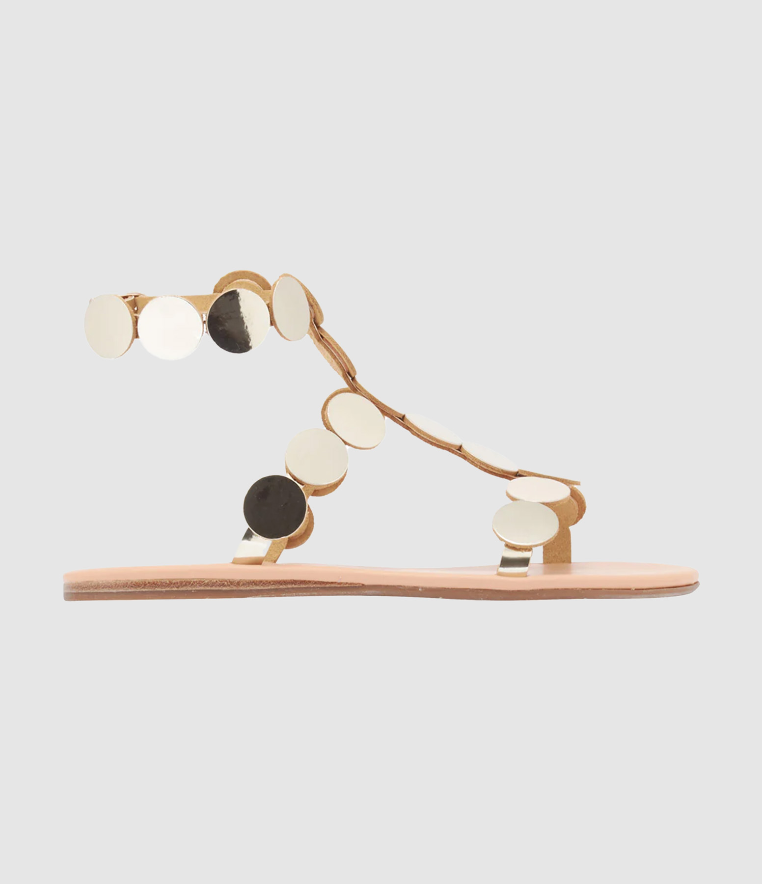 Sandales plates avec détails ronds dorés. Bride réglable à la cheville.
