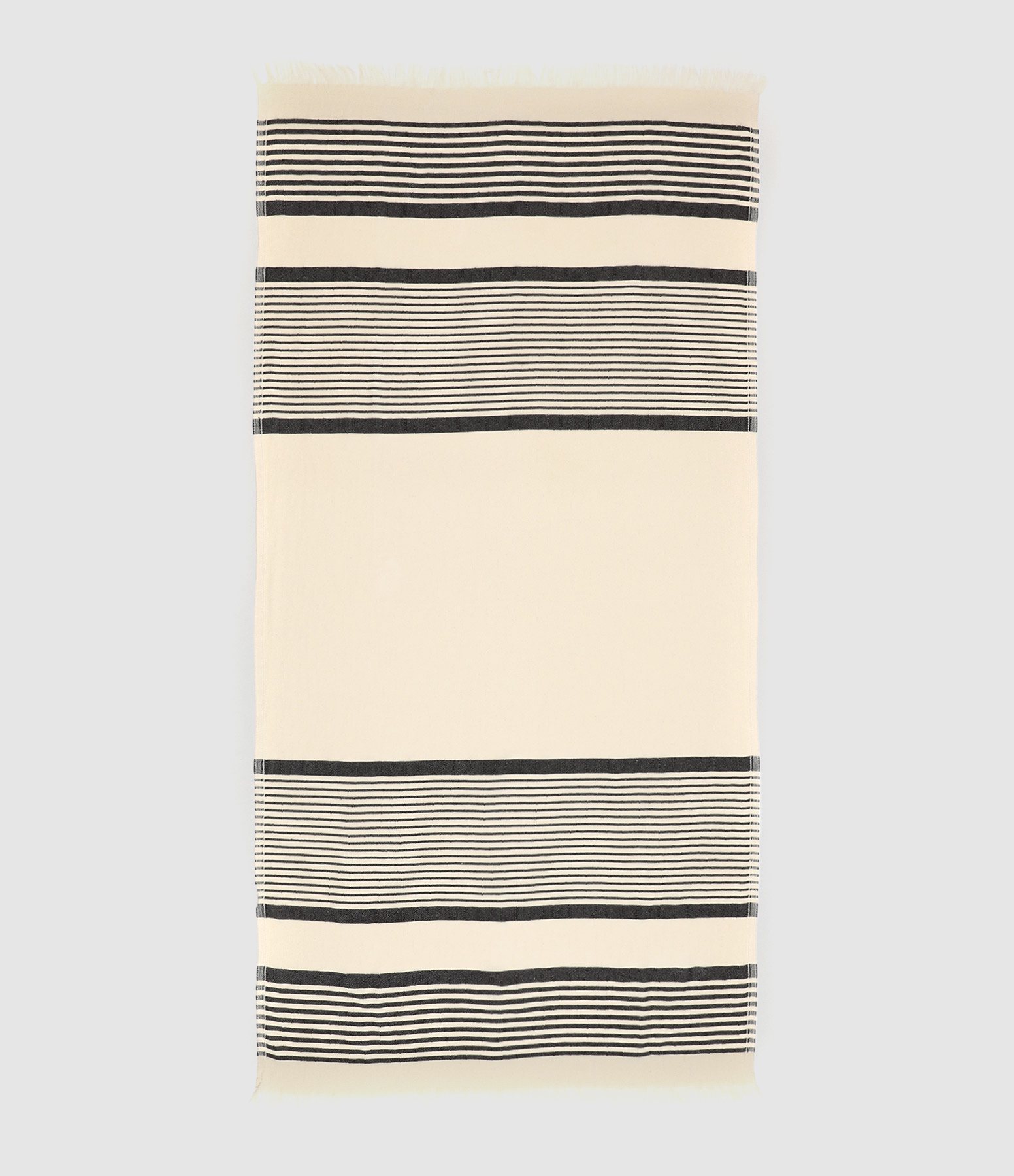 Serviette à rayures noires et blanches. Bords à franges.