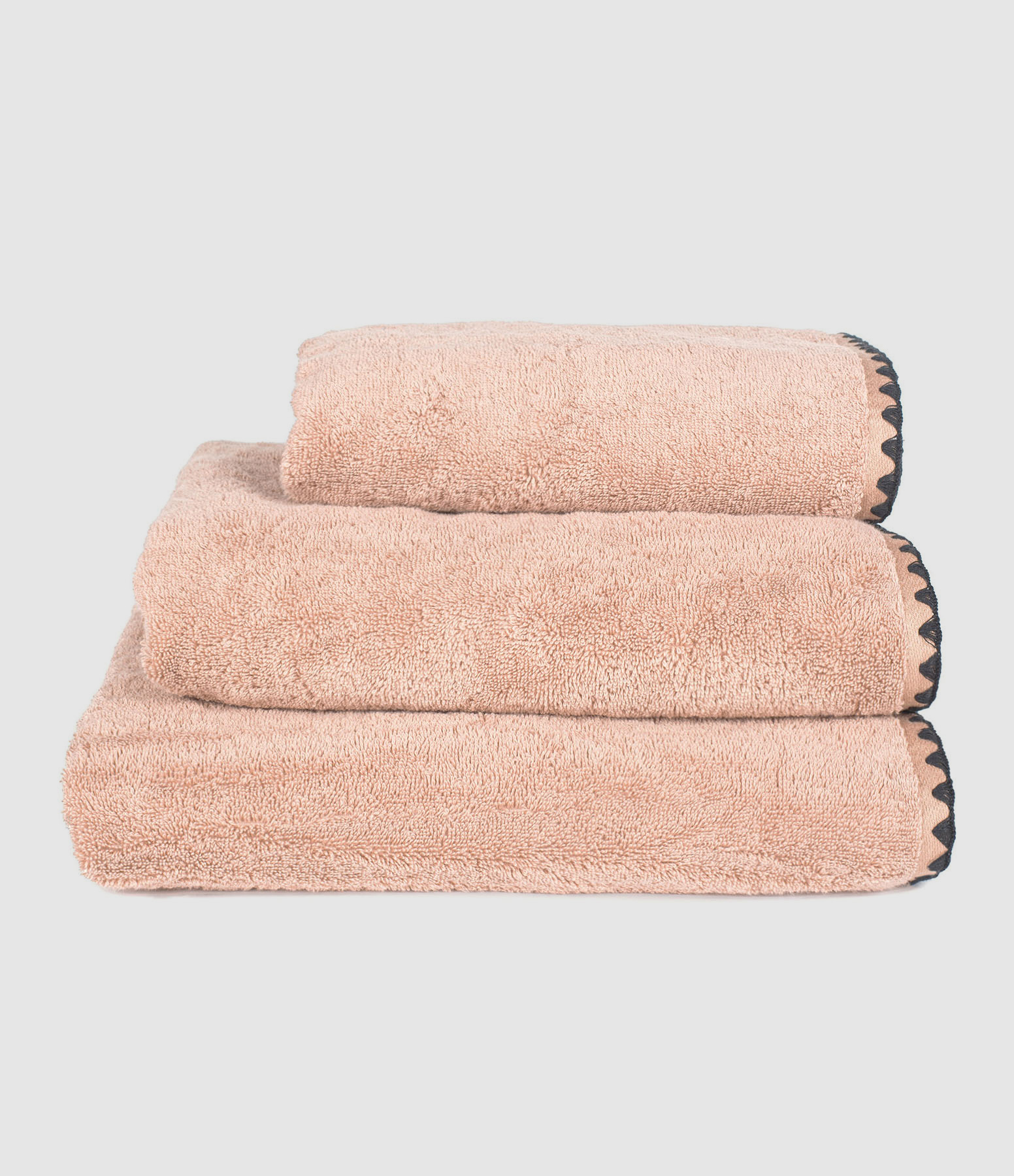 Serviette de toilette en coton beige rosé 550 g/m2 avec finition crochet noir.